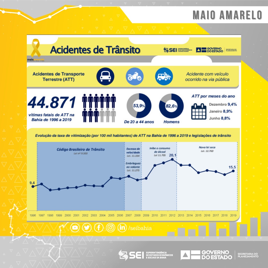 O mês de maio é referência para o Dia das Mães e para as noivas. No entanto, é também quando se concentram campanhas de conscientização contra a violência no trânsito: o Maio Amarelo. Todos os dias, milhares de pessoas são mortas e feridas no trânsito e outras passarão tempos hospitalizadas e sem condições de viver normalmente após eventos envolvendo veículos. Um levantamento feito pela Superintendência de Estudos Econômicos e Sociais da Bahia (SEI) identificou que em 2019 as principais vítimas de Acidentes de Transporte Terrestre (ATT) no estado são os motociclistas (31,3%). Ou seja, aproximadamente, 1/3 da vitimização de acidentes de trânsito na Bahia foi em decorrência de um evento envolvendo motociclistas. Neste mesmo ano, os ocupantes de veículos representavam 29,7% dos casos, seguidos por pedestres, com 13,5%.