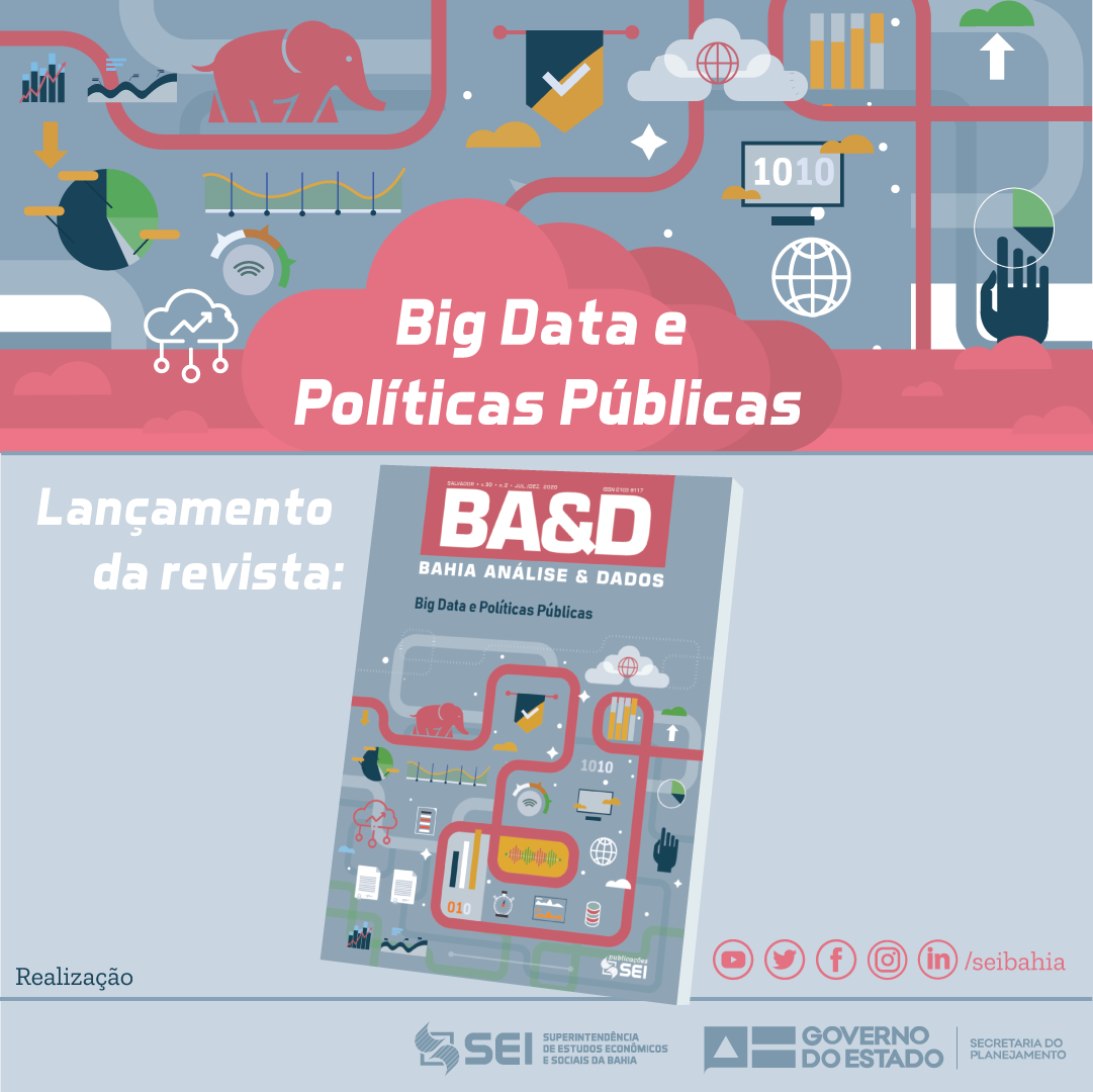 A Superintendência de Estudos Econômicos e Sociais da Bahia (SEI) lançou nesta manhã (4) em evento on-line, que segue disponível na plataforma de streaming Youtube, a nova edição da revista Bahia Análise & Dados, com o tema Big Data e Políticas Públicas. A publicação faz parte da missão da instituição de estimular a produção e a publicação científica de conhecimento, evocando as possibilidades de estudos, aplicações e análises a partir de grandes bancos de dados e sua incorporação à gestão pública.
