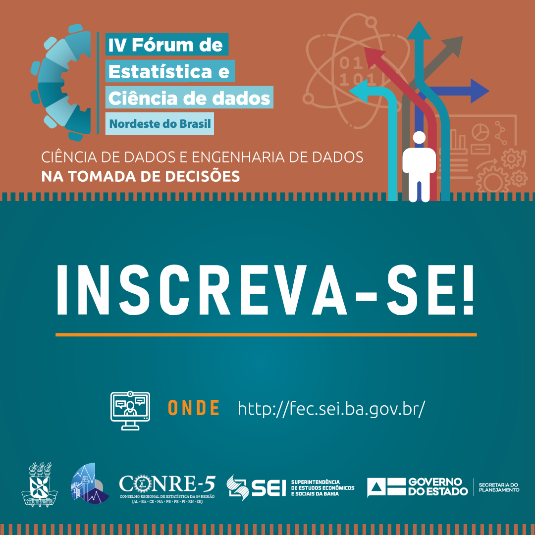 O IV Fórum de Estatística e Ciência de Dados, com o tema “Ciência de dados e Engenharia de dados na tomada de decisões”, realizado pelo Conselho Regional de Estética da 5ª Região (Conre-5), o departamento de Estatística da Universidade Federal da Bahia (UFBA) e a Superintendência de Estudos Econômicos e Sociais da Bahia (SEI), ocorrerá entre os dias 17 a 19 de agosto, na plataforma de streaming YouTube, da SEI Bahia, gratuito com certificação.