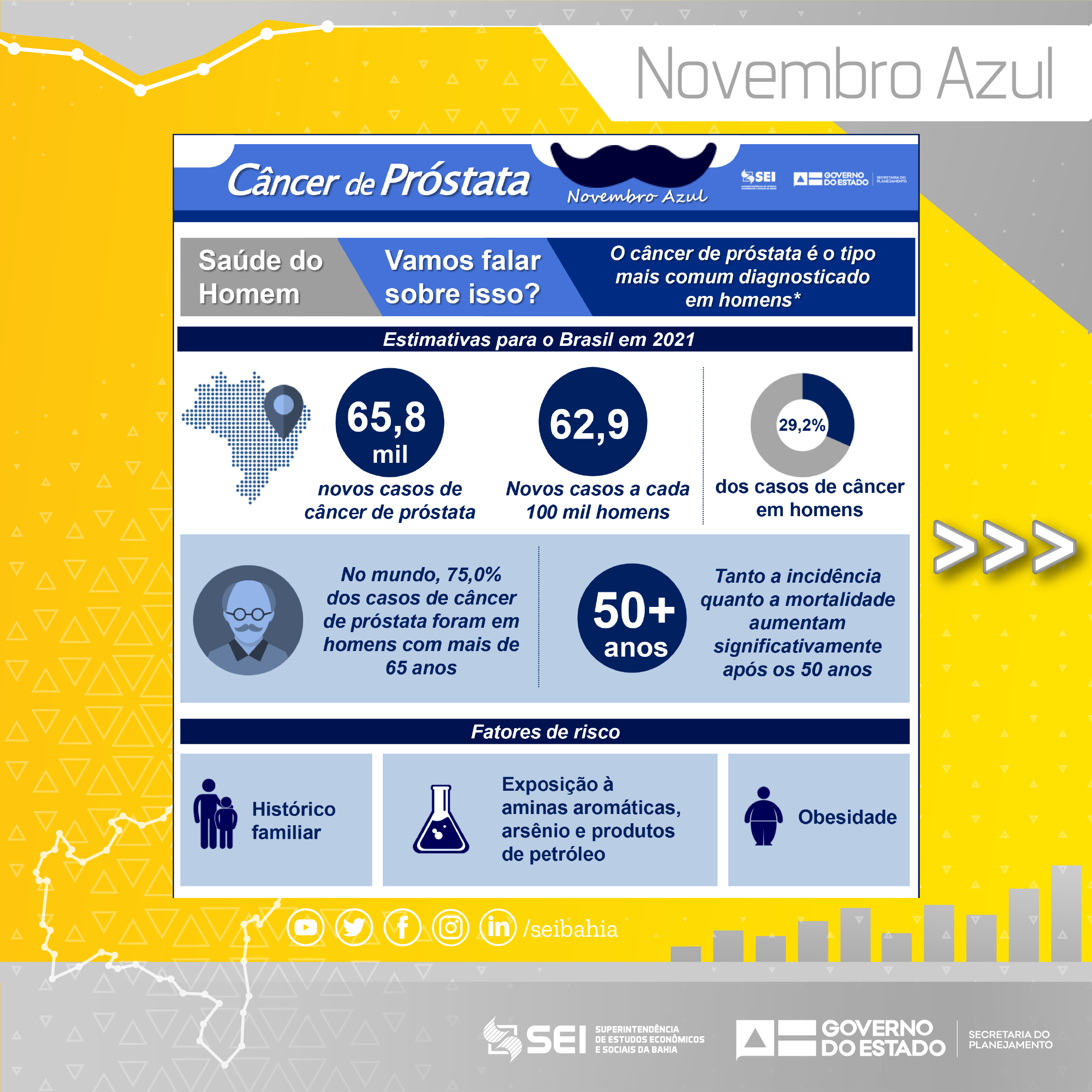 A Superintendência de Estudos Econômicos e Sociais da Bahia (SEI), autarquia vinculada à Secretaria do Planejamento (Seplan), sistematizou dados do Departamento de Informática do Sistema Único de Saúde (Datasus) e analisou informações do Instituto Nacional de Câncer (Inca) sobre os aspectos do câncer de próstata no âmbito Bahia e Brasil. O objetivo é ampliar as discussões em torno dessa temática que é tão relevante para a saúde do homem.