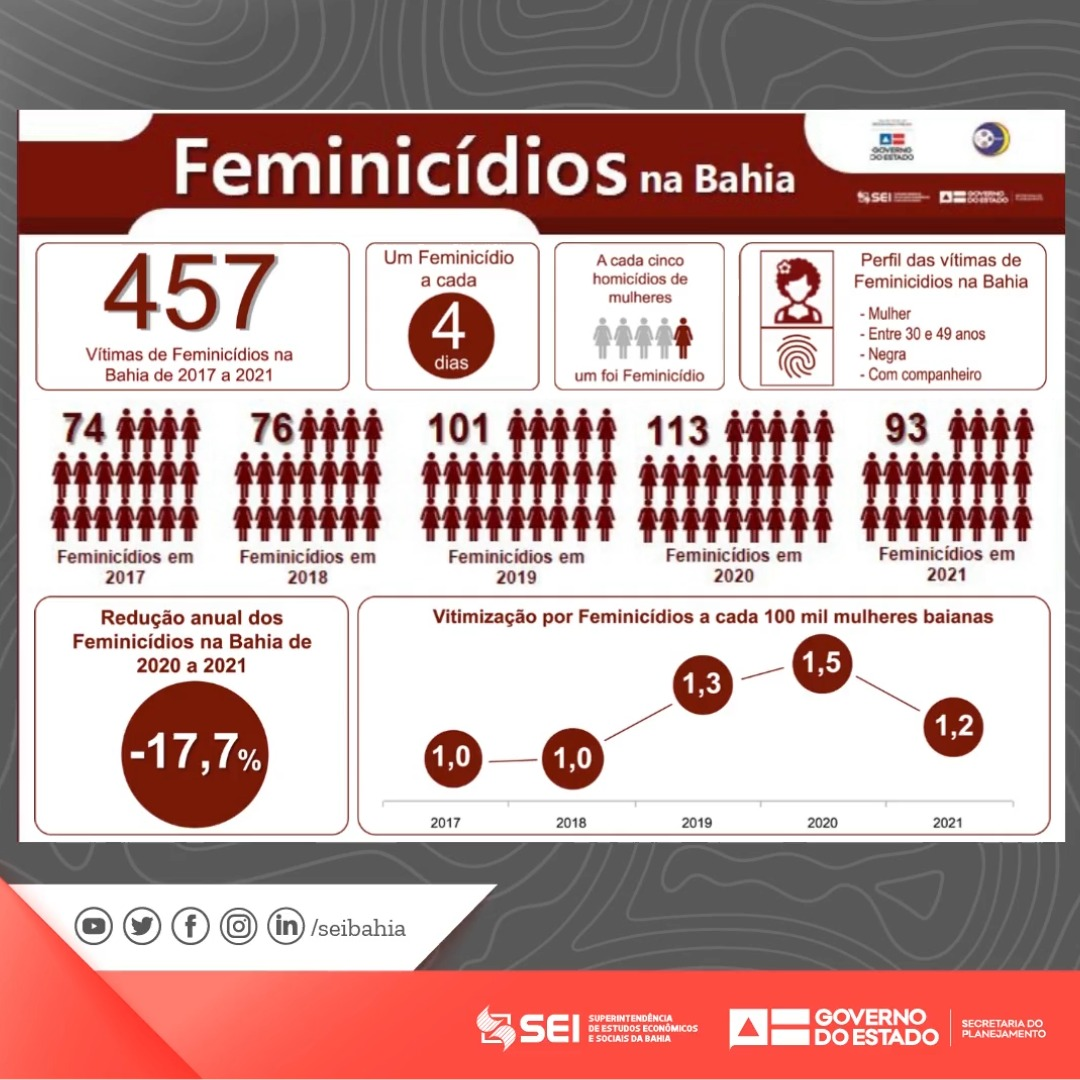 457 mulheres foram vítimas de feminicídios na Bahia, de 2017 a 2021. Ou seja, uma mulher foi morta por questões de gênero a cada 4 dias na Bahia. Apesar desse fenômeno ser crescente a uma taxa média anual de 4,7%, houve redução do número de vítimas no último ano. Em 2020 foram 113 vítimas e já em 2021 foram 93 mulheres vítimas de feminicídio na Bahia, representando uma redução de aproximadamente 18%. Ou seja, 1,2 mulheres foram vítimas de femincídios a cada 100 mil baianas em 2021. Os dados divulgados nesta quarta-feira (1/06) são da Secretaria da Segurança Pública da Bahia (SSP-BA) em parceria com a Superintendência de Estudos Econômicos e Sociais da Bahia (SEI).