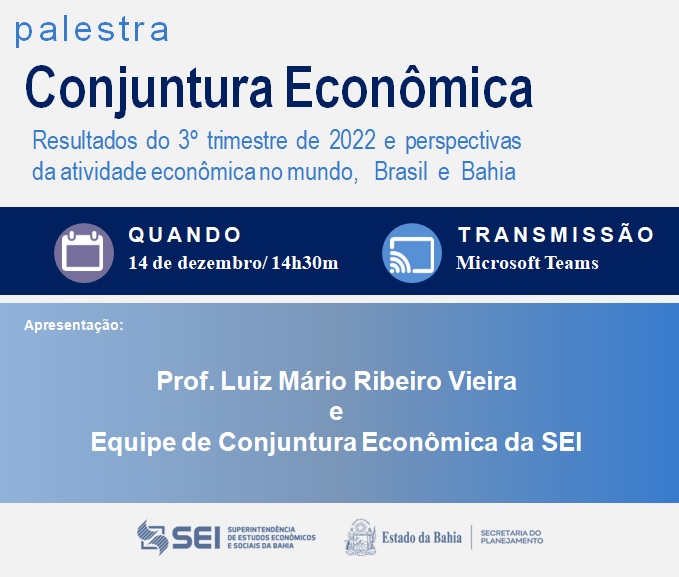 Quarta-feira (14/12) às 14h30, ocorrerá a palestra on-line de Conjuntura Econômica, realizada pela Superintendência de Estudos Econômicos e Sociais da Bahia (SEI), autarquia vinculada à Secretaria de Planejamento (Seplan), através da plataforma Teams Meeting.