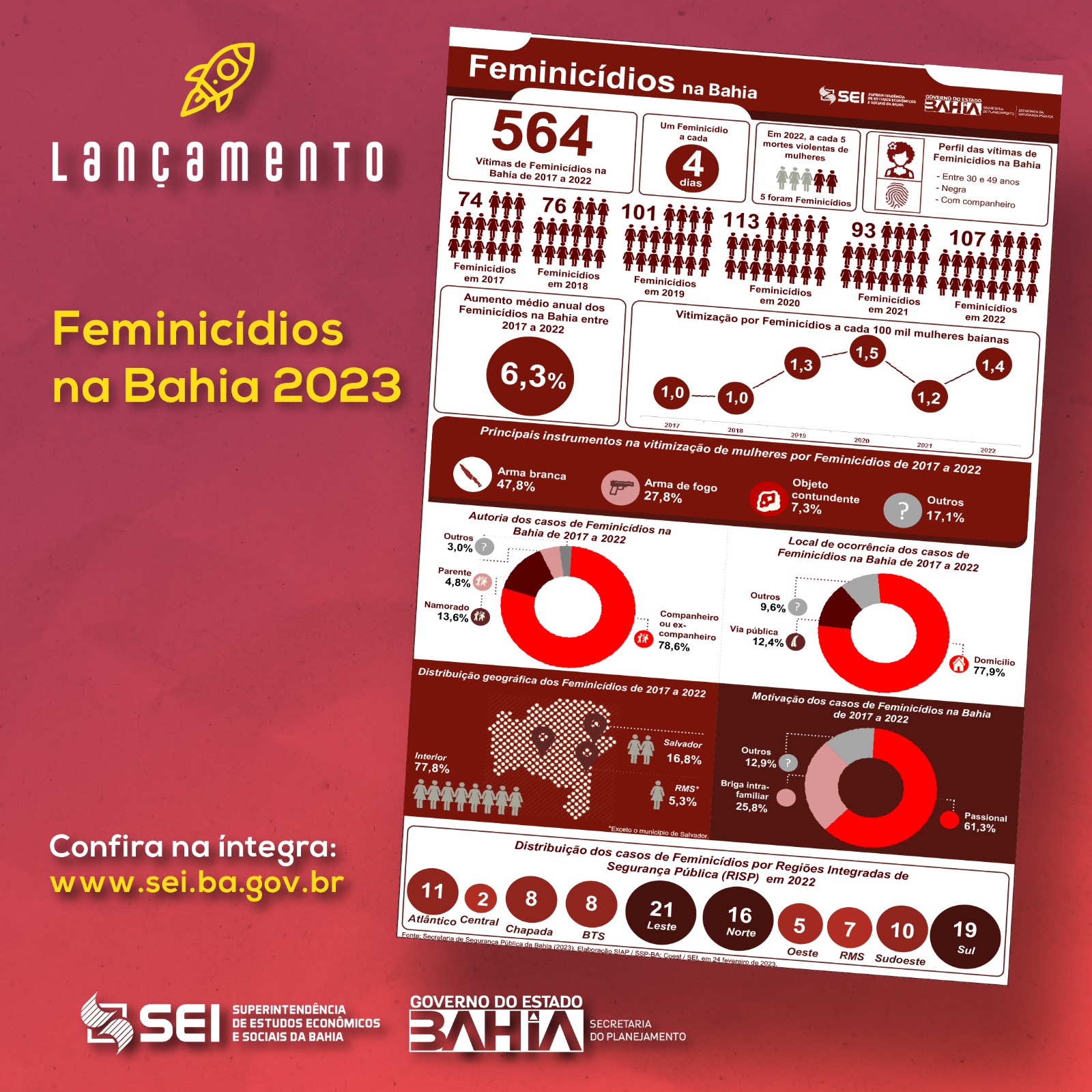 A Superintendência de Estudos Econômicos e Sociais da Bahia (SEI) e a Secretaria da Segurança Pública da Bahia (SSP-BA) divulgam, em parceria, a edição 2023 do estudo Feminicídios na Bahia. Este é o terceiro ano de divulgação do tema e marca o compromisso dos órgãos com a luta das mulheres nesse 8 de março, Dia Internacional da Mulher. Os dados são publicados por meio de um infográfico-síntese que acompanha uma série histórica de 2017 a 2022.