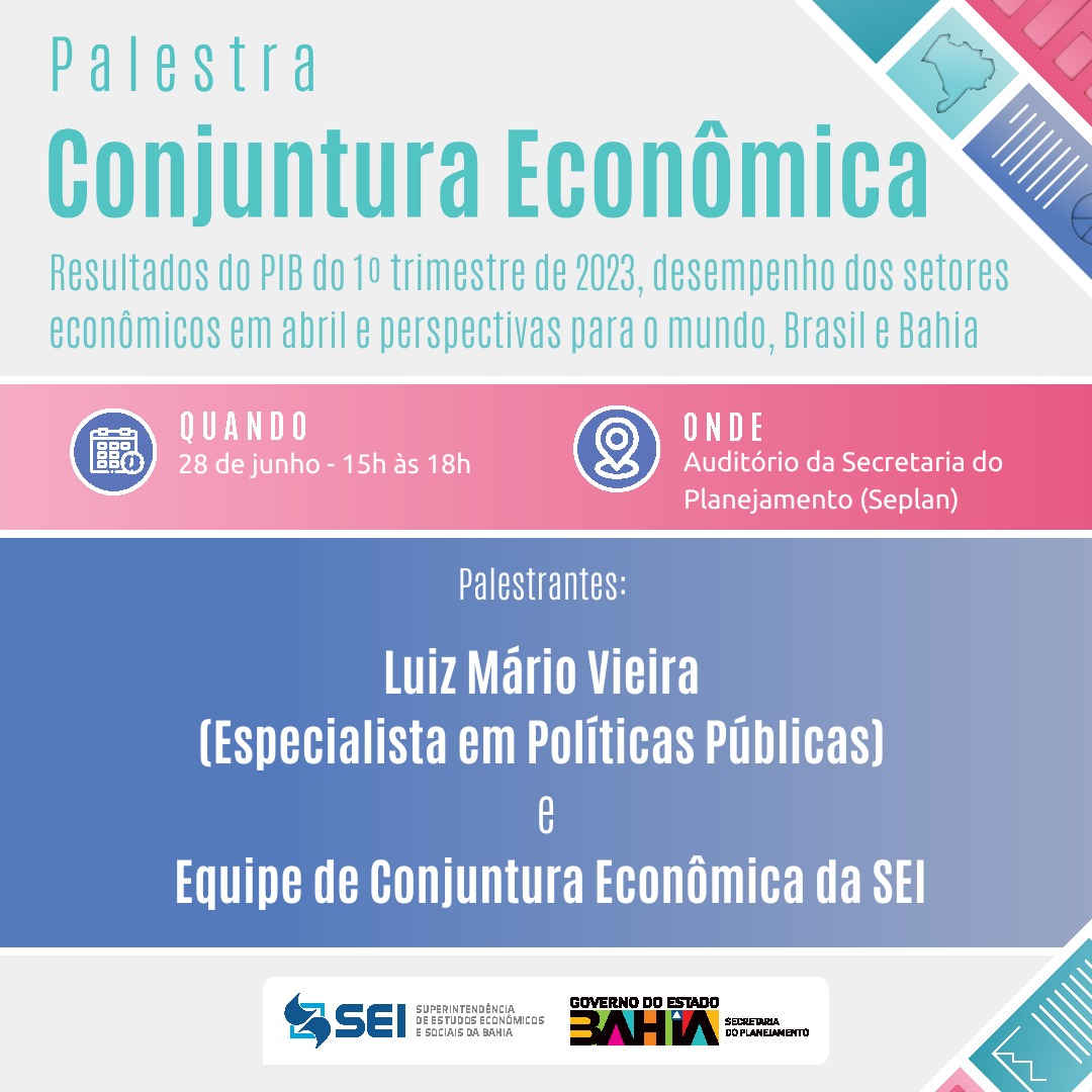 A Superintendência de Estudos Econômicos e Sociais da Bahia (SEI), autarquia vinculada à Secretaria do Planejamento (Seplan), realiza palestra trimestral de Conjuntura Econômica, no dia 28 de junho, das 15h às 18h, no auditório da Seplan (Centro Administrativo da Bahia, Av. Luís Viana Filho, 2ª Avenida, 250). O evento tem como propósito apresentar os resultados do PIB do 1º trimestre de 2023, o desempenho dos setores econômicos em abril e as perspectivas para os próximos meses, fornecendo insights valiosos sobre a economia local e global.