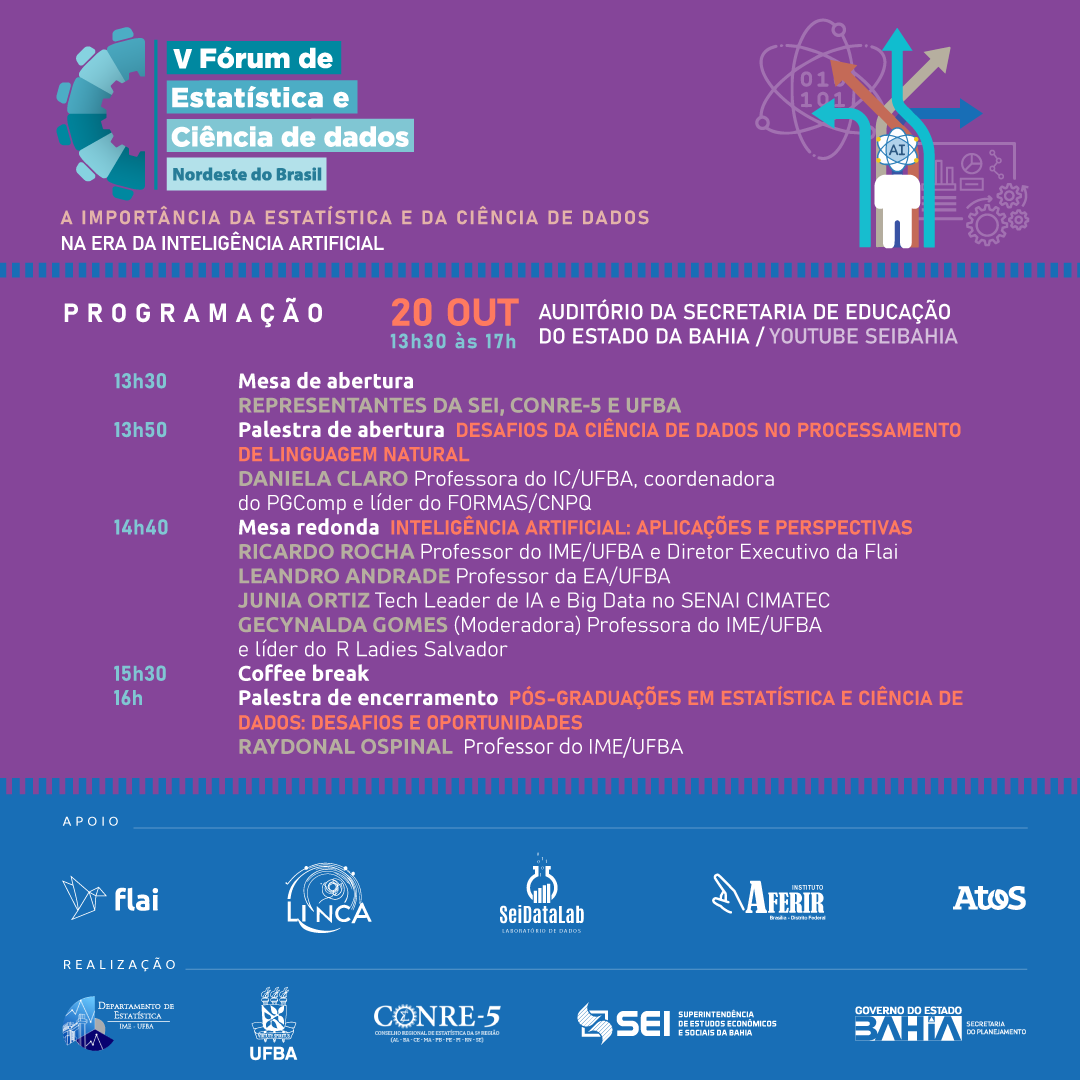 Na mesa redonda Inteligência Artificial: aplicações e perspectivas participam: Ricardo Rocha, doutor e especialista em Data Science e Inteligência Artificial, professor da UFBA e fundador da FLAI - Inteligência Artificial; Júnia Ortiz, especialista em Ciência de Dados e Big Data e doutora em Comunicação pela UFBA; Leandro Andrade, professor e pesquisador de Tecnologia da Informação da Escola de Administração da UFBA; com mediação da professora doutora Gecynalda Gomes (IME/UFBA). A palestra final será com Raydonal Ospina, professor doutor do Departamento de Estatística da UFBA.