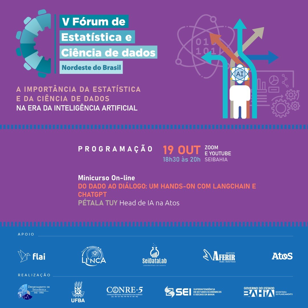 Nesta quinta e sexta-feira, dias 19 e 20 de outubro, a o estado da Bahia sedia o V Fórum de Estatística e Ciência de Dados do Nordeste. Palestras, mesa redonda e minicurso vão abordar desafios e perspectivas na área da Inteligência Artificial. O evento começa dia 19 de outubro, no canal YouTube/SEIBAHIA, a partir das 18h30, com o minicurso on-line Do dado ao diálogo: um hands-on com LangChain e ChatGPT, ministrado por Pétala Tuy, estatística, mestra em ciência da computação e doutoranda da Universidade Federal da Bahia (UFBA). No dia 20, as palestras e mesa redonda acontecem no auditório da Secretaria de Educação do Estado da Bahia (5ª Avenida, nº 550, Centro Administrativo da Bahia - CAB), com transmissão on-line. O evento é gratuito e as inscrições estão abertas no site fec.sei.ba.gov.br.