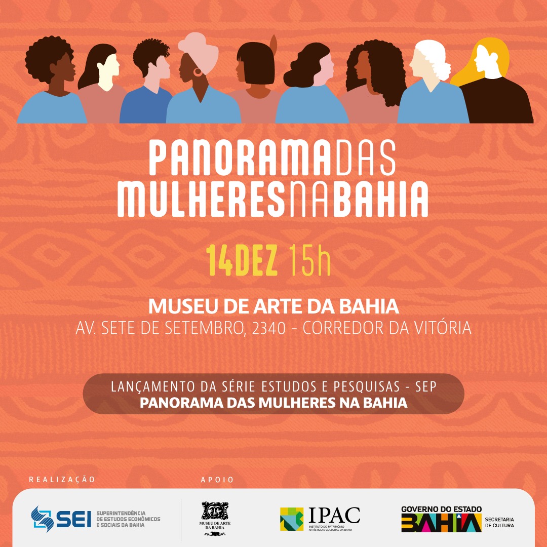 A Superintendência de Estudos Econômicos e Sociais da Bahia (SEI), autarquia vinculada à Secretaria do Planejamento do Estado, realizará o evento Panorama das Mulheres na Bahia, no auditório do Museu de Arte da Bahia (MAB), no dia 14 de dezembro, a partir das 15h. O evento é aberto ao público até a lotação do espaço e irá promover uma rodada de discussão sobre a condição da mulher baiana em diversas dimensões, incluindo a questão racial, trabalho, renda, saúde e outras. Na oportunidade, será lançada a nova edição da Série Estudos e Pesquisas (SEP) sobre o tema Panorama das Mulheres na Bahia, livro elaborado pela SEI com o objetivo de contribuir para o entendimento e a visibilidade do tema.Abertura do evento conta com a mostra de solos femininos da Escola de Dança da Fundação Cultural do Estado da Bahia (Funceb), com as dançarinas Mailane Castro, Emily Lopes e Elaine Zanco, e coordenação de Giltanei Amorim (coordenador da Funceb). E contará ainda com a apresentação musical de Dona Salvadora e as Morenas de Itapuã e participação de Amélia da Cuica, sob a regência do músico Amadeu Alves. Para as discussões do panorama, o evento convida Creuza Oliveira, primeira trabalhadora doméstica doutora honoris causa no Brasil, representante do Sindicato das Trabalhadoras Domésticas da Bahia (Sindoméstico-BA) e uma das protagonistas da aprovação da PEC das domésticas, sendo uma referência no Brasil na luta da categoria, que é uma das maiores com mão de obra feminina no país. Também participa Camila Garcez, advogada, integrante da Comissão de Combate à Intolerância Religiosa da Ordem dos Advogados da Bahia (OAB-BA) e articulista da coluna Olhares Interseccionais, do Portal Migalhas, atuando na questão racial e feminista.Silvia Lúcia Ferreira, professora doutora e pesquisadora do Núcleo de Estudos Interdisciplinares sobre a Mulher da Universidade Federal da Bahia (NEIM/UFBA) e também fundadora e líder de pesquisa do GEM - Centro de Estudos e Pesquisas sobre Mulheres, Gênero, Saúde e Enfermagem, da Escola de Enfermagem da UFBA, vai abordar questões de gênero e saúde. E Diana Lúcia Gonzaga, professora doutora e pesquisadora do Departamento de Economia e do Programa de Pós-Graduação em Economia da UFBA e coordenadora do Grupo de Pesquisas em Economia do Trabalho da UFBA (GeTrab-UFBA), vai contribuir com informações sobre trabalho para a mulher no estado. A conversa será mediada pela analista técnica da SEI Carlota Gottschall.Este evento conta com o apoio da Secretaria de Políticas para as Mulheres (SPM) e da Secretaria de Cultura (Secult), por meio do Museu de Arte da Bahia (MAB) e do Instituto do Patrimônio Artístico e Cultural da Bahia (IPAC).A SEP 109 foi coordenada pela Diretoria de Indicadores e Estatísticas da SEI e apresenta textos e análises considerando quatro dimensões relevantes para a mulher: formação sociocultural, saúde, mercado de trabalho e segurança. Os artigos passam pela estrutura sociocultural brasileira que lastreia a condição atual das mulheres; o padrão de morbimortalidade das mulheres na Bahia e no Brasil; a inserção da mulher no mercado de trabalho no Brasil e na Bahia, evidenciando o padrão das desigualdades de gênero; e o padrão para a ocorrência dos feminicídios na Bahia. Na oportunidade, exemplares da edição serão distribuídos gratuitamente ao público presente. Também será disponibilizada a versão digital, em breve, no site.