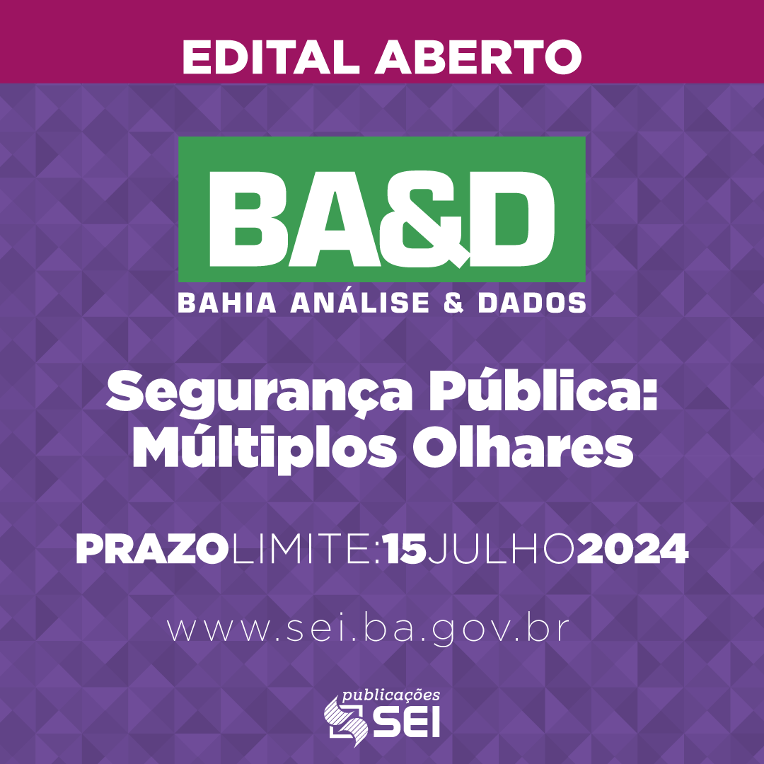 Está aberto, a partir desta segunda-feira (15/04), o processo seletivo para submissão de artigos científicos para a revista Bahia Análise & Dados (BA&D), v. 34, n. 2, com o tema Segurança pública: múltiplos olhares. O edital acaba de ser divulgado no site da Superintendência de Estudos Econômicos e Sociais da Bahia – SEI (sei.ba.gov.br). O prazo-limite para envio de artigos é 15 de julho de 2024 através do e-mail baedseg2024@sei.ba.gov.br.