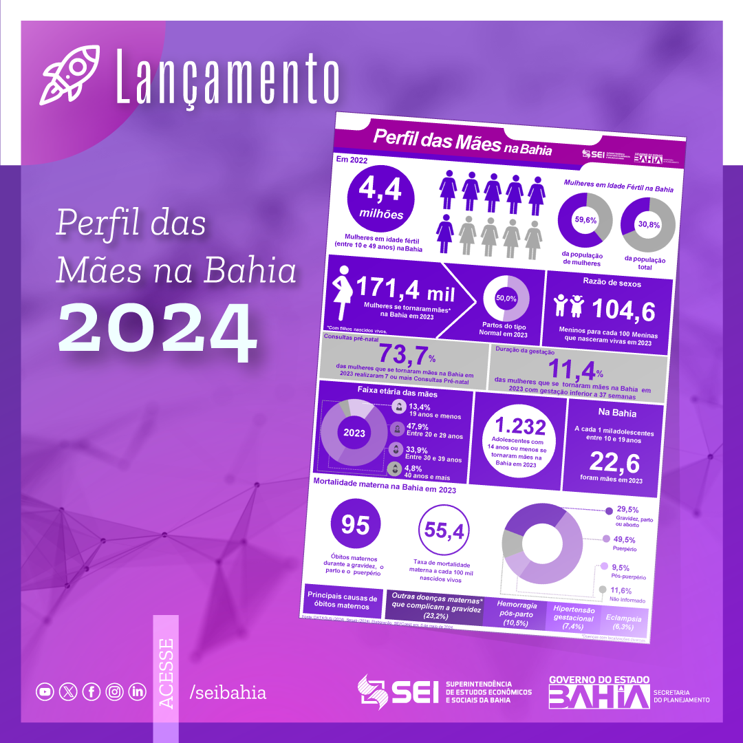 Para marcar o Dia das Mães, que será comemorado no próximo domingo, a Superintendência de Estudos Econômicos e Sociais da Bahia (SEI) apresenta o infográfico Perfil das Mães na Bahia,  um breve panorama de indicadores que descrevem o retrato das mulheres que se tornaram mães no estado em 2023.