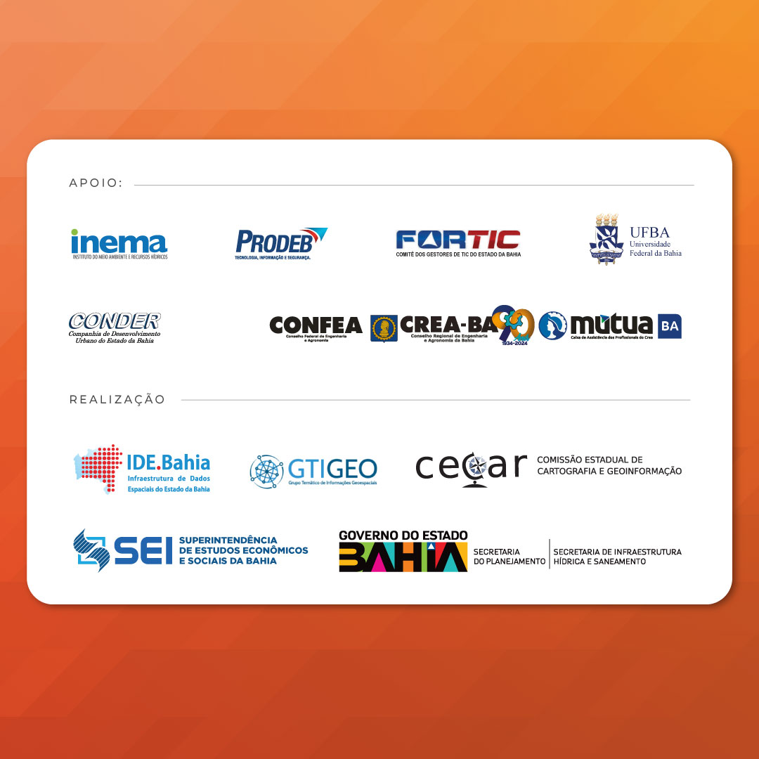 Promovido pela Comissão Estadual de Cartografia e Geoinformação (Cecar) e coordenado pela Superintendência de Estudos Econômicos e Sociais da Bahia (SEI), o encontro reunirá especialistas dos setores público e privado, academia e comunidade de pesquisa de várias partes do país. A iniciativa é realizada em parceria com o Grupo Temático de Informações Geoespaciais (GTIGeo) e o Comitê de Gestores de Tecnologia da Informação e Comunicação do Estado da Bahia (Fortic).