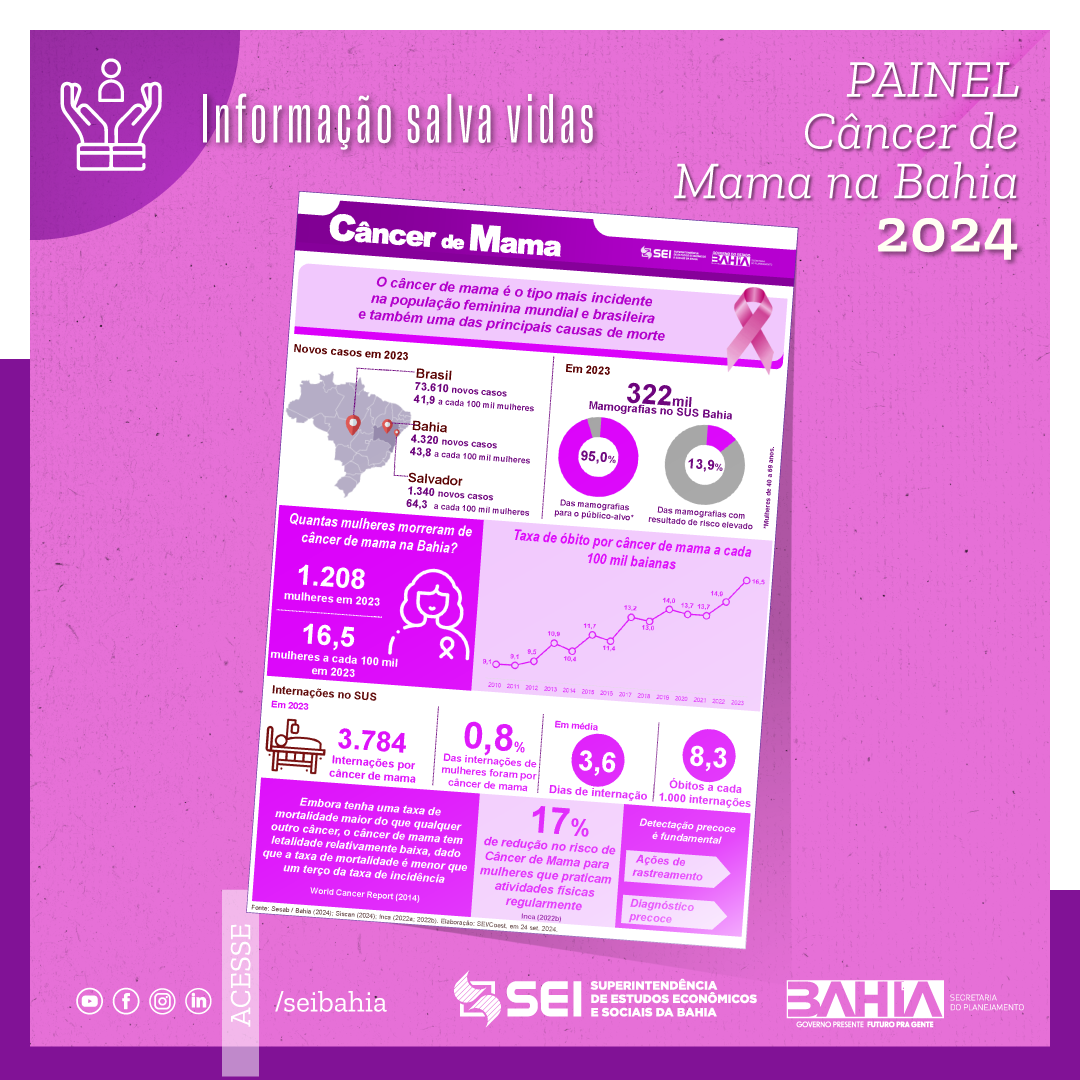 A Superintendência de Estudos Econômicos e Sociais da Bahia (SEI) apresenta a atualização do Painel do Câncer de Mama entre as mulheres baianas, em formato de infográfico. O câncer de mama é um problema de grande relevância para a saúde pública, pois é a principal causa de morte entre as mulheres entre todos os tipos de neoplasias malignas.