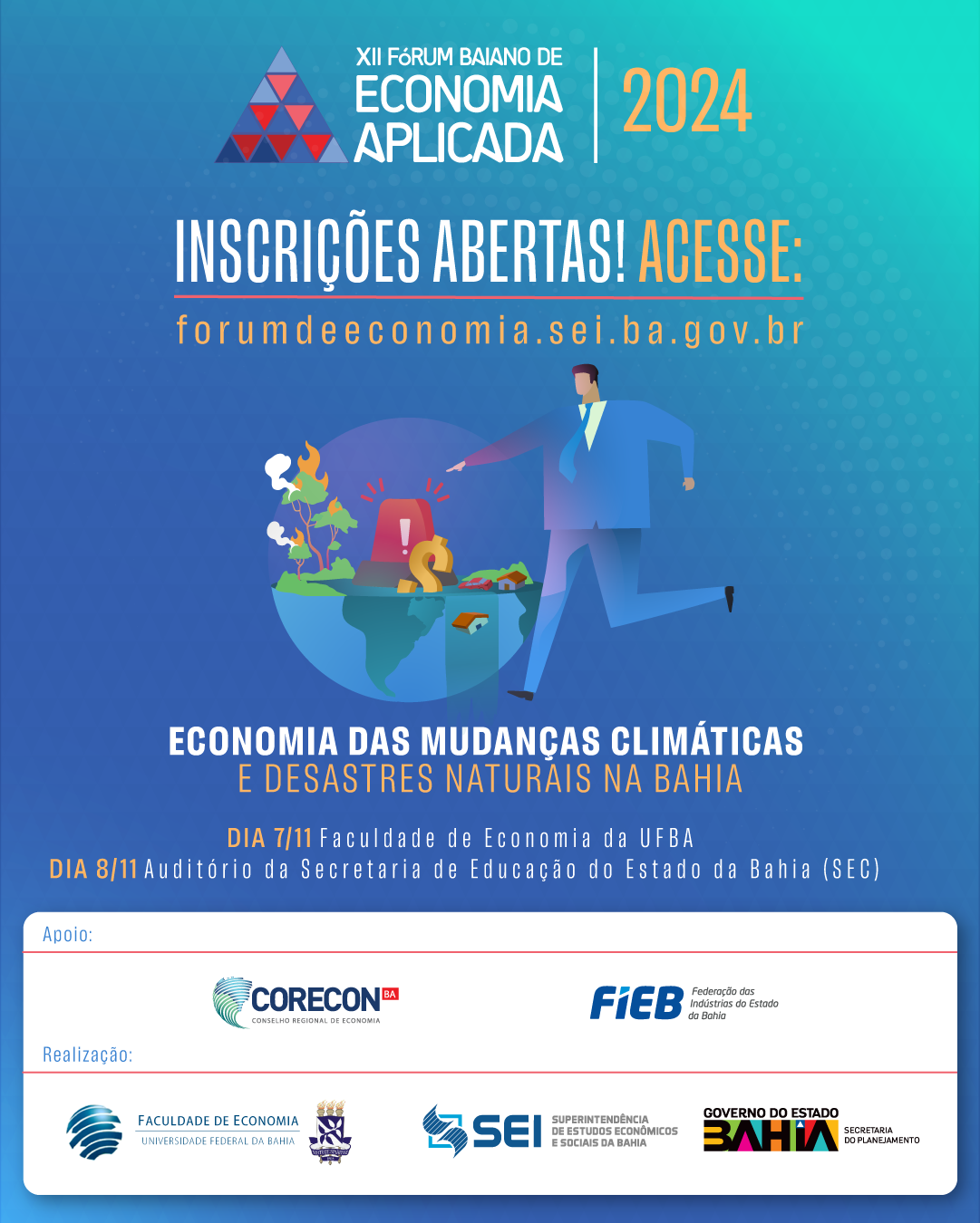 Promovido pela Superintendência de Estudos Econômicos e Sociais da Bahia (SEI) e pelo Grupo de Economia Aplicada da UFBA, o fórum conta, este ano, com o apoio da Federação das Indústrias do Estado da Bahia (FIEB) e do Conselho Regional de Economia da Bahia (Corecon-BA).