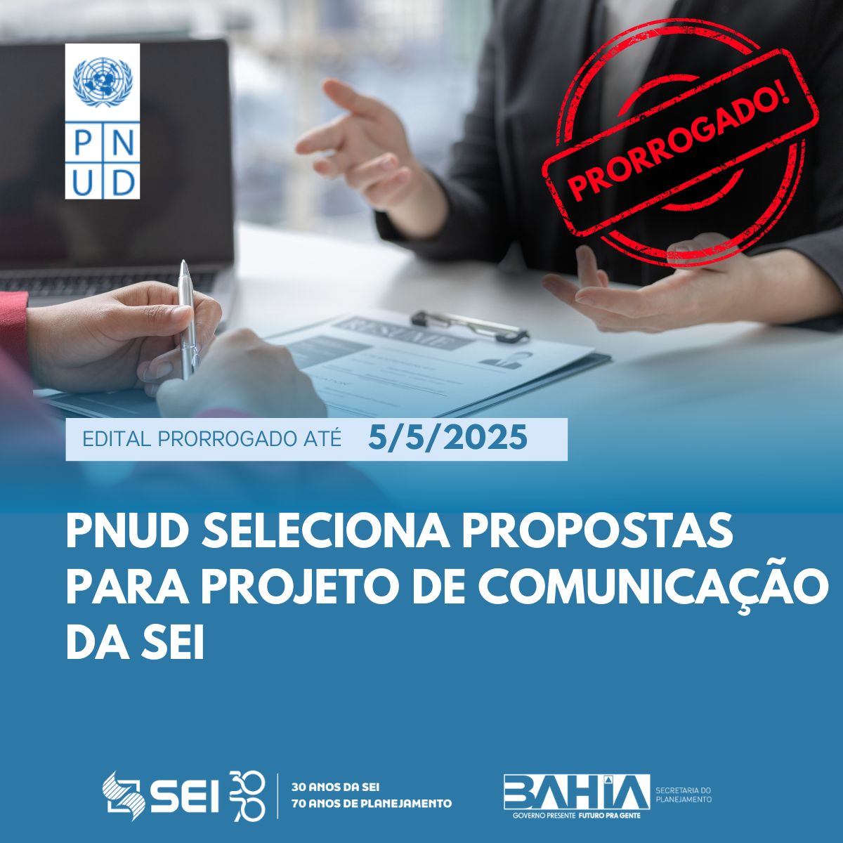 Foi prorrogado até o próximo dia 5 de maio o prazo para recebimento de propostas de produtos estratégicos em comunicação para a SEI, por meio do edital do Programa das Nações Unidas para o Desenvolvimento (PNUD).