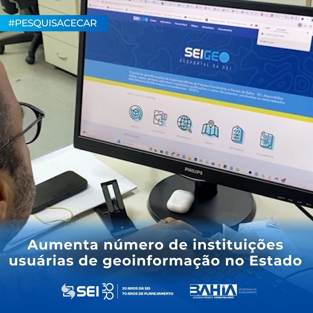 A Comissão Estadual de Cartografia e Geoinformação (Cecar), coordenada pela Superintendência de Estudos Econômicos e Sociais da Bahia (SEI), apresenta os resultados da última pesquisa anual sobre o uso de geoinformação por órgãos do Governo Estado da Bahia, relativa ao ano de 2024. A Pesquisa Cecar 2024 aponta crescimento de 34 para 49 no número de instituições do executivo estadual que declaram utilizar a geoinformação para o desenvolvimento das suas atividades.