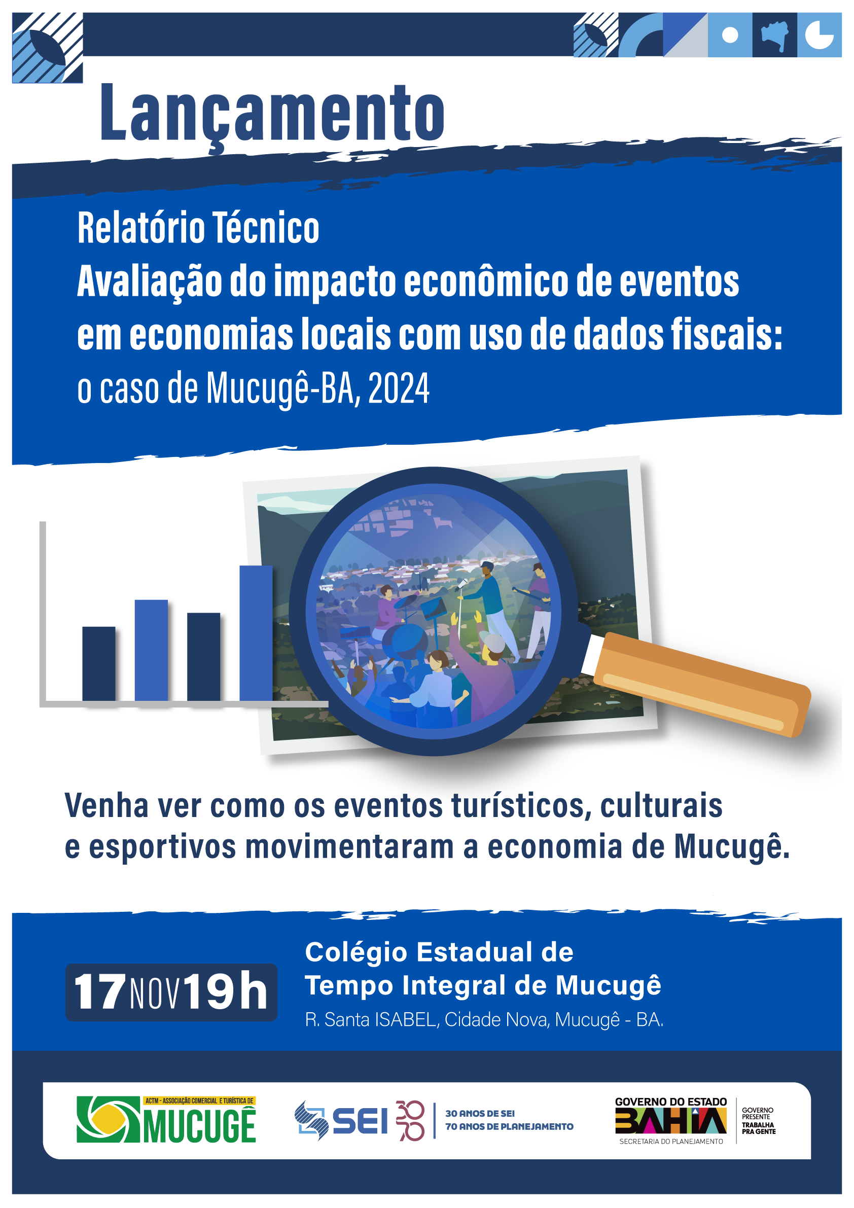 A Superintendência de Estudos Econômicos e Sociais da Bahia (SEI) realiza, no dia 17 de novembro, às 19h, no Colégio Estadual de Tempo Integral de Mucugê, o lançamento do Relatório Técnico “Avaliação do impacto econômico de eventos em economias locais com uso de dados fiscais: o caso de Mucugê-BA, 2024”.