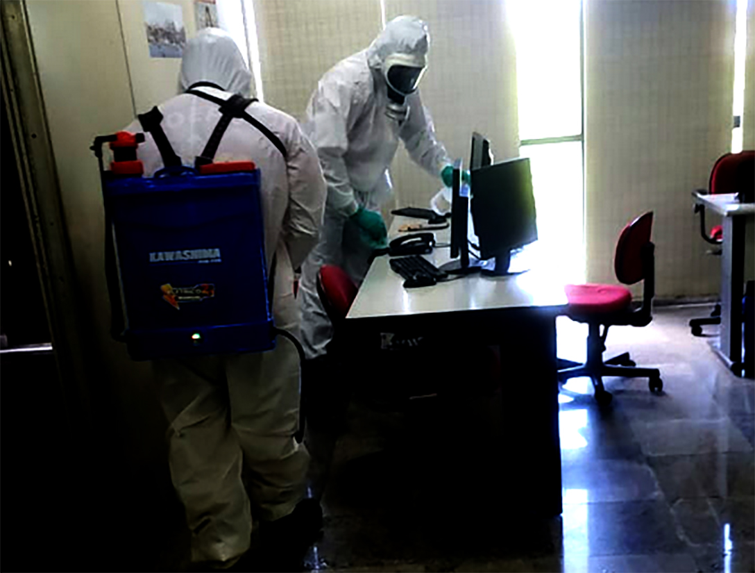 Para a desinfecção, que acontece nos ambientes internos e áreas externas, os militares utilizam hipoclorito de sódio a 1%. A limpeza também acontece nos equipamentos eletrônicos, como computadores, além de maçanetas. Mas, mesmo após a descontaminação, é fundamental que os frequentadores utilizem as máscaras e álcool em gel para a higienização.
