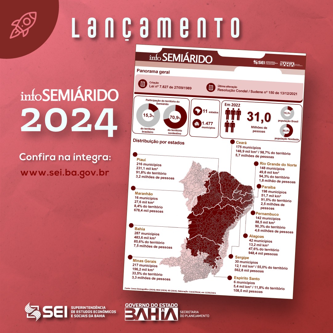 A Bahia é o estado que reúne a maior quantidade de municípios no Semiárido Brasileiro: de 417 municípios baianos, 287 deles estão dentro dos limites do Semiárido, o que representa 85,6% de todo o território da Bahia. Em 2022, a população total vivendo nessa área era de 7,5 milhões de baianos, ou seja, metade da população do estado. Essas informações estão reunidas no Info Semiárido 2024, um compêndio de dados em formato de infográfico que a Superintendência de Estudos Econômicos e Sociais da Bahia (SEI) atualiza anualmente.