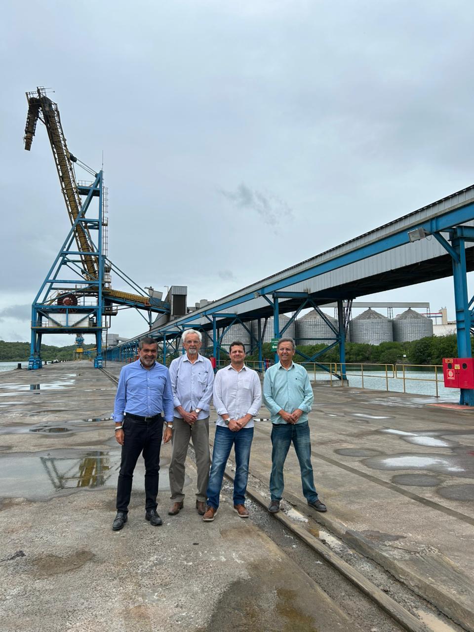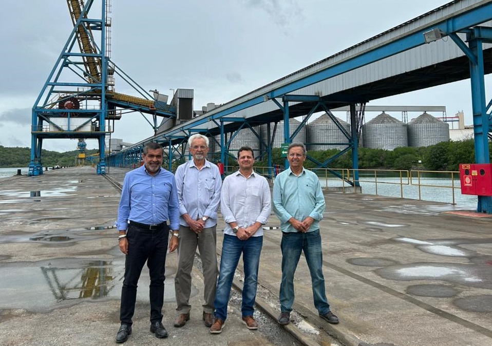 Em visita ao Terminal Portuário Cotegipe, localizado na Baía de Aratu, nesta segunda-feira (25), o secretário estadual do Planejamento, Cláudio Peixoto, percorreu as instalações  do equipamento, como os silos e armazéns existentes para estocagem de grãos, além de conhecer o projeto em curso para ampliar a capacidade de atracação das embarcações. Acompanhado pelo assessor especial da Seplan, Antônio Alberto Valença, e o diretor de Estudos da Superintendência de Estudos Econômicos e Sociais da Bahia – SEI, Edgar Porto, o secretário foi recebido pelo vice-presidente da Porto Participações, Sérgio Faria, e o diretor de Operações do Porto Cotegipe, Jorge Humberto Pessôa.