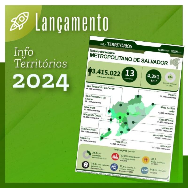 A Superintendência de Estudos Econômicos e Sociais da Bahia (SEI) acaba de lançar a atualização do Info Territórios, um panorama de dados socioeconômicos dos 27 Territórios de Identidade (TI) da Bahia, em formato de infográficos.
