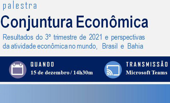 Quarta-feira (15/12) às 14h30, ocorrerá a palestra on-line de Conjuntura Econômica, realizada pela Superintendência de Estudos Econômicos e Sociais da Bahia (SEI), autarquia vinculada à Secretaria de Planejamento (Seplan), através da plataforma Teams Meeting.