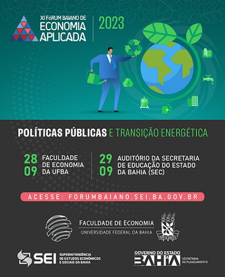 Nos dias 28 e 29 de setembro, acontece o XI Fórum Baiano de Economia Aplicada. O evento vai reunir pesquisadores, estudantes, iniciativa privada e setor público para tratar sobre o tema Políticas públicas e transição energética. As inscrições são gratuitas e podem ser feitas no endereço forumbaiano.sei.ba.gov.br. A programação completa também está disponível nesse endereço.
