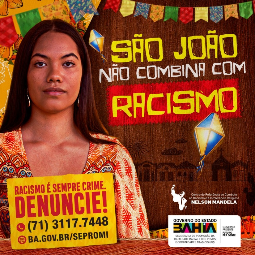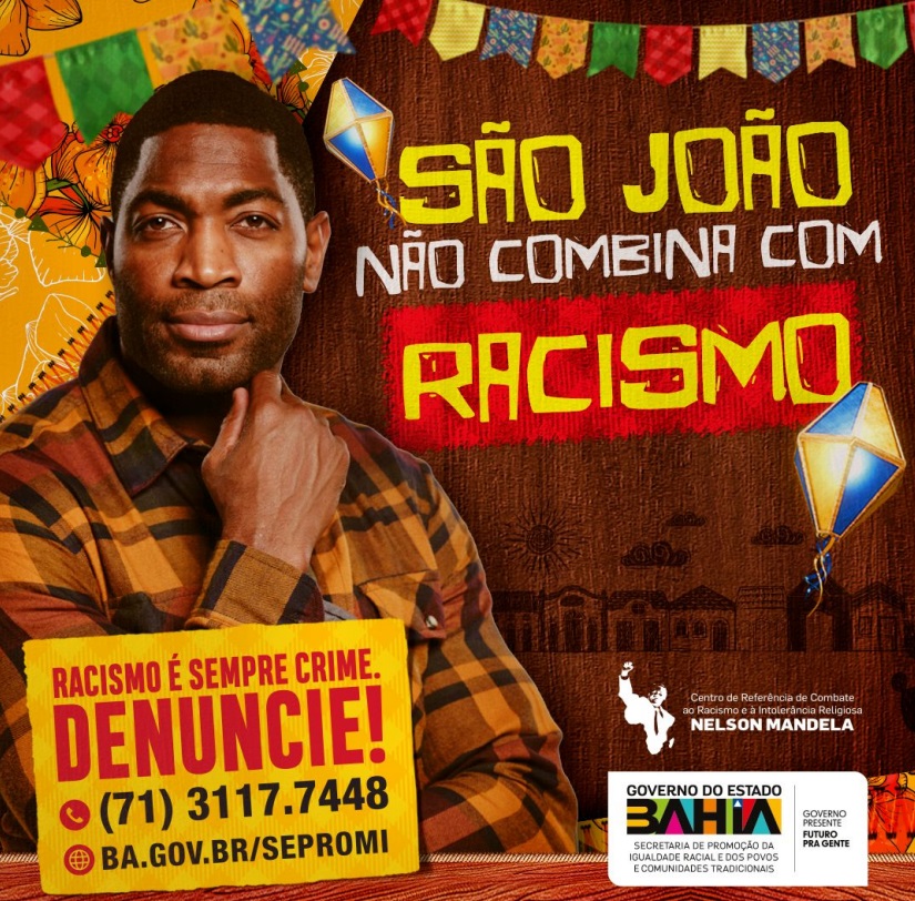 A campanha “São João Não Combina com Racismo” será realizada pela Secretaria de Promoção da Igualdade Racial e dos Povos e Comunidades Tradicionais (Sepromi) nas principais festas juninas da Bahia. A ação consiste na distribuição de material educativo e na presença do Centro de Combate ao Racismo e à Intolerância Religiosa Nelson Mandela (CRNM) em 11 municípios do estado: Cachoeira, Cruz das Almas, São Sebastião do Passé, Senhor do Bonfim, Irecê, São Francisco do Conde, Ituberá, Camaçari, Lauro de Freitas, Itacaré e Salvador.