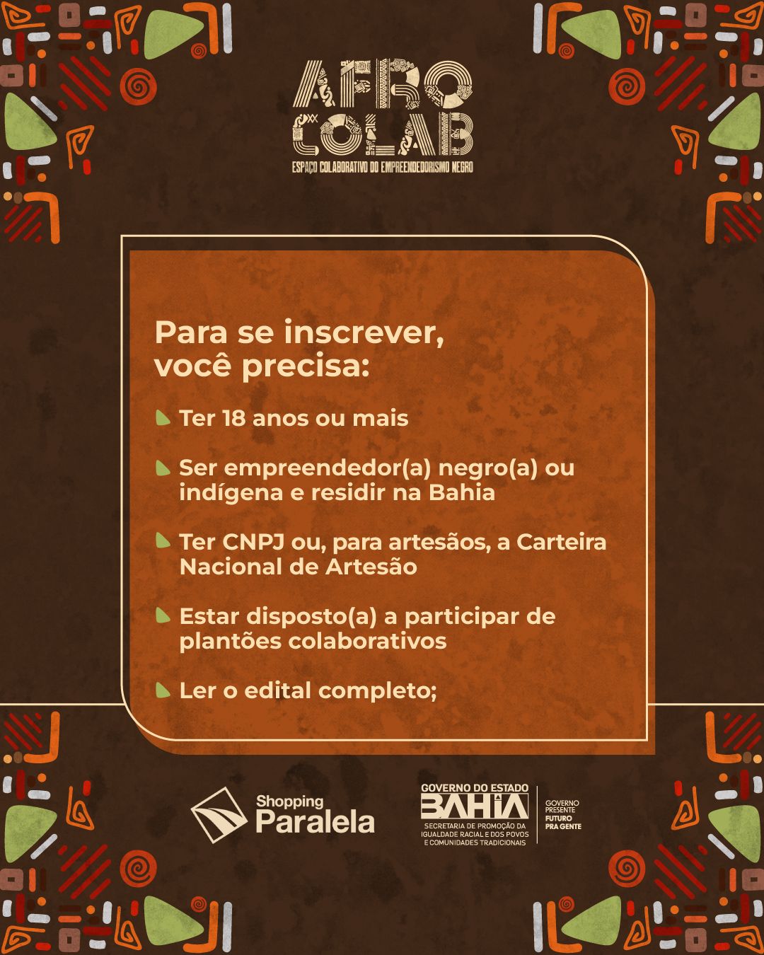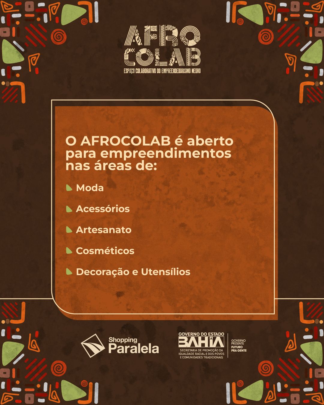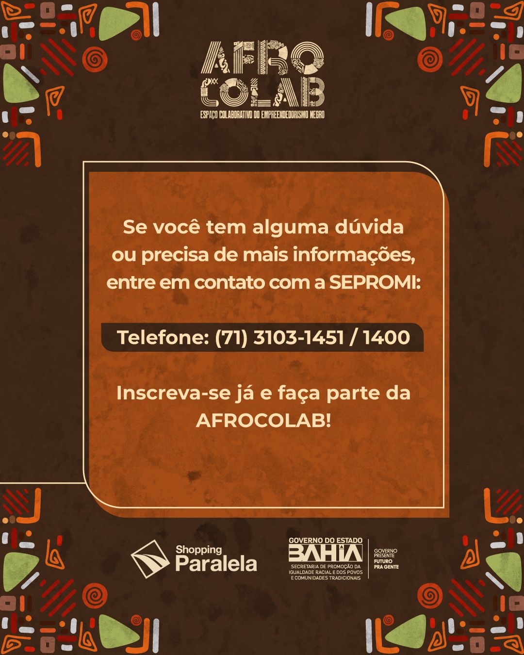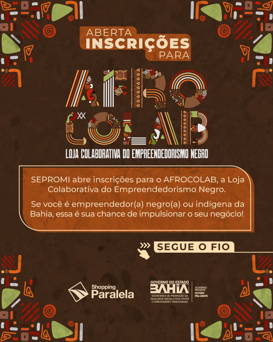 A Secretaria de Promoção da Igualdade Racial e Povos e Comunidades Tradicionais da Bahia - SEPROMI abriu as inscrições para interessados(as) em fazer parte Loja Colaborativa do Empreendedorismo Negro - AFROCOLAB, do Shopping Paralela, em Salvador. Aberta a partir de hoje(19) e designada para empreendedores(as) negros(as) e indígenas maiores de 18 anos, as inscrições devem ser realizadas através do formulário online, até o dia 23 de março, ás 18h.