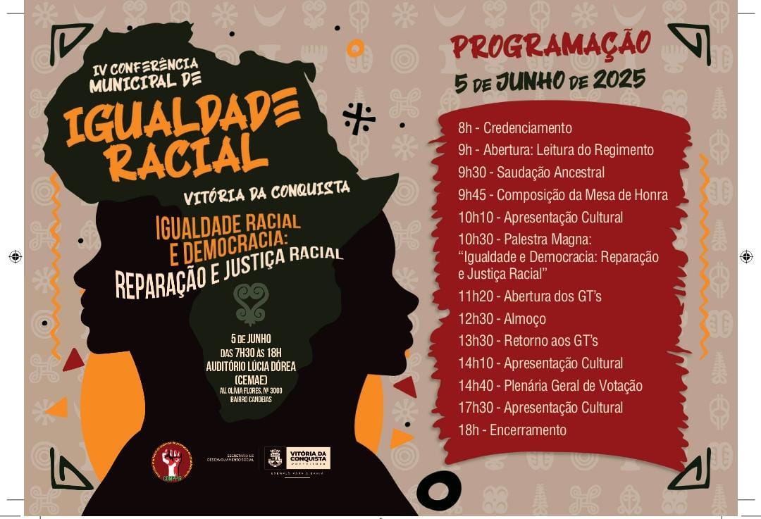 A população de Vitória da Conquista participa da IV Conferência Municipal de Promoção da Igualdade Racial, nesta quinta-feira (5), no auditório Lúcia Dórea (Cemae). Com o tema “Igualdade e Democracia: Reparação e Justiça Racial”, a conferência tem o objetivo de assegurar a participação democrática de toda a população do município, com destaque para a população negra, comunidades quilombolas, povos ciganos, povos indígenas, povos de terreiro e comunidades tradicionais de matriz africana.