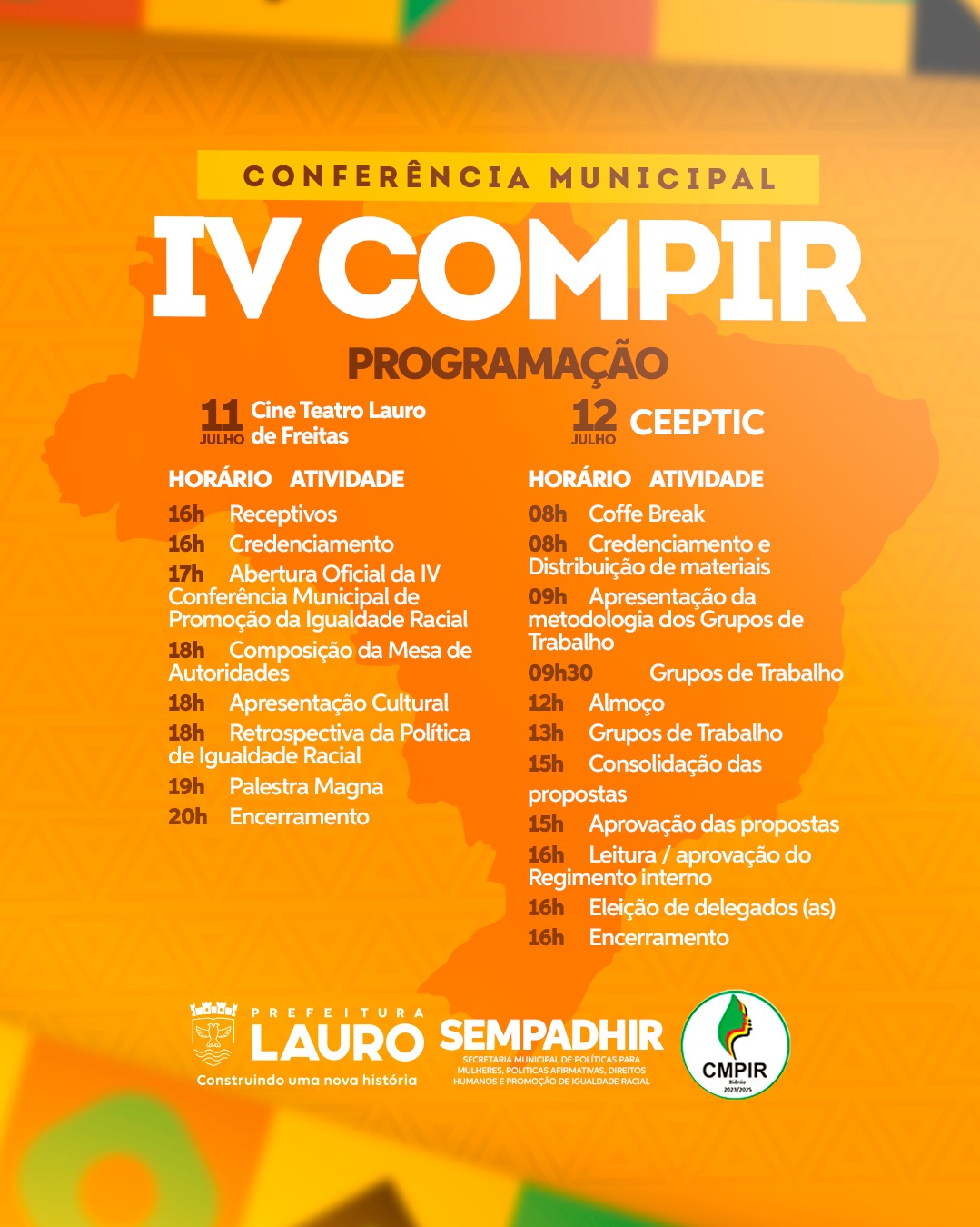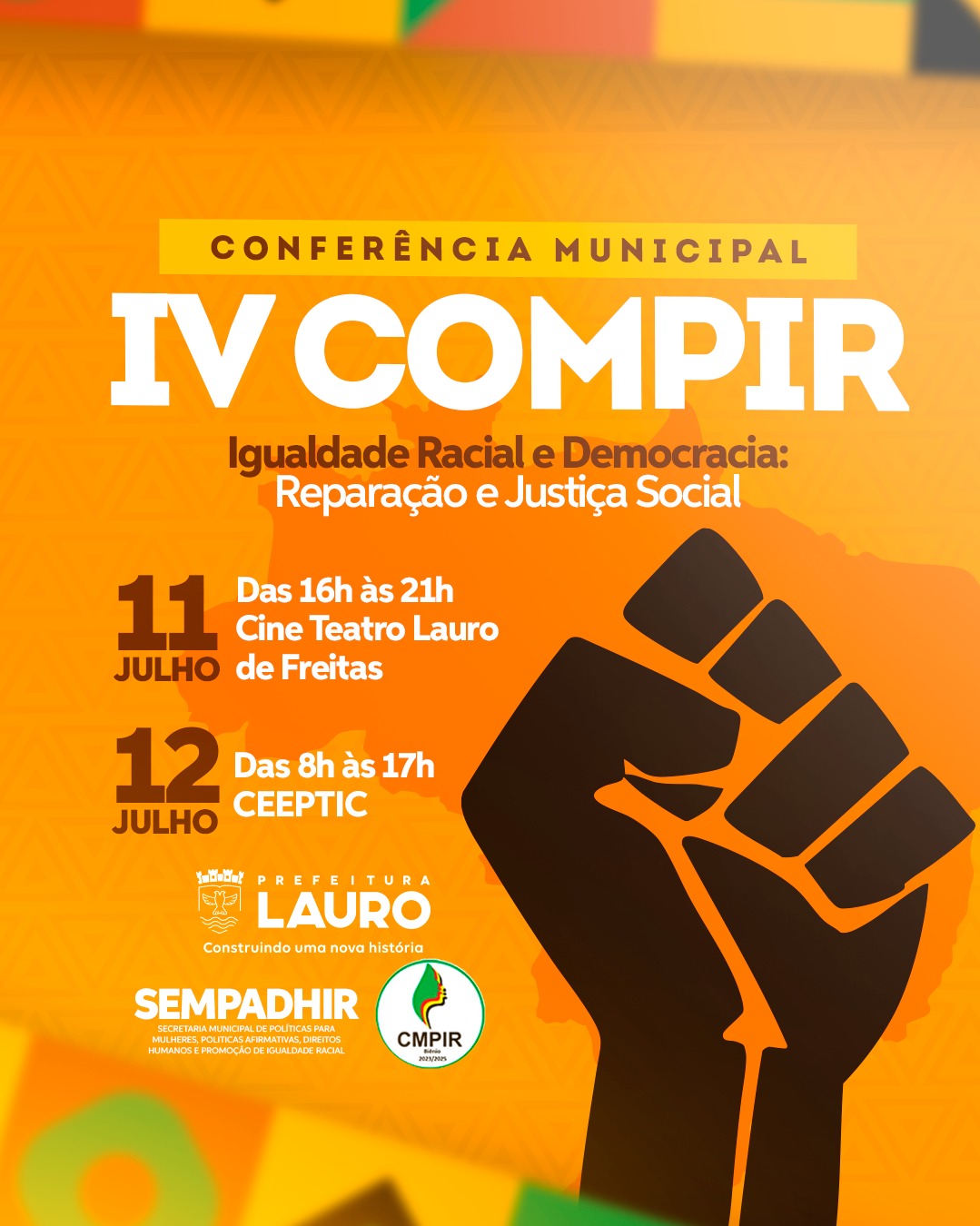 Com o objetivo de fortalecer as políticas públicas voltadas à equidade racial, a Prefeitura de Lauro de Freitas, através da Secretaria Municipal da Mulher, Políticas Afirmativas, Direitos Humanos e Promoção da Igualdade Racial (SEMPADHIR), promove a IV Conferência Municipal de Promoção de Igualdade Racial (COMPIR), com o tema: Igualdade Racial e Democracia - Reparação e Justiça Social. O evento acontecerá em dois espaços, nos dias 11 e 12 de julho.