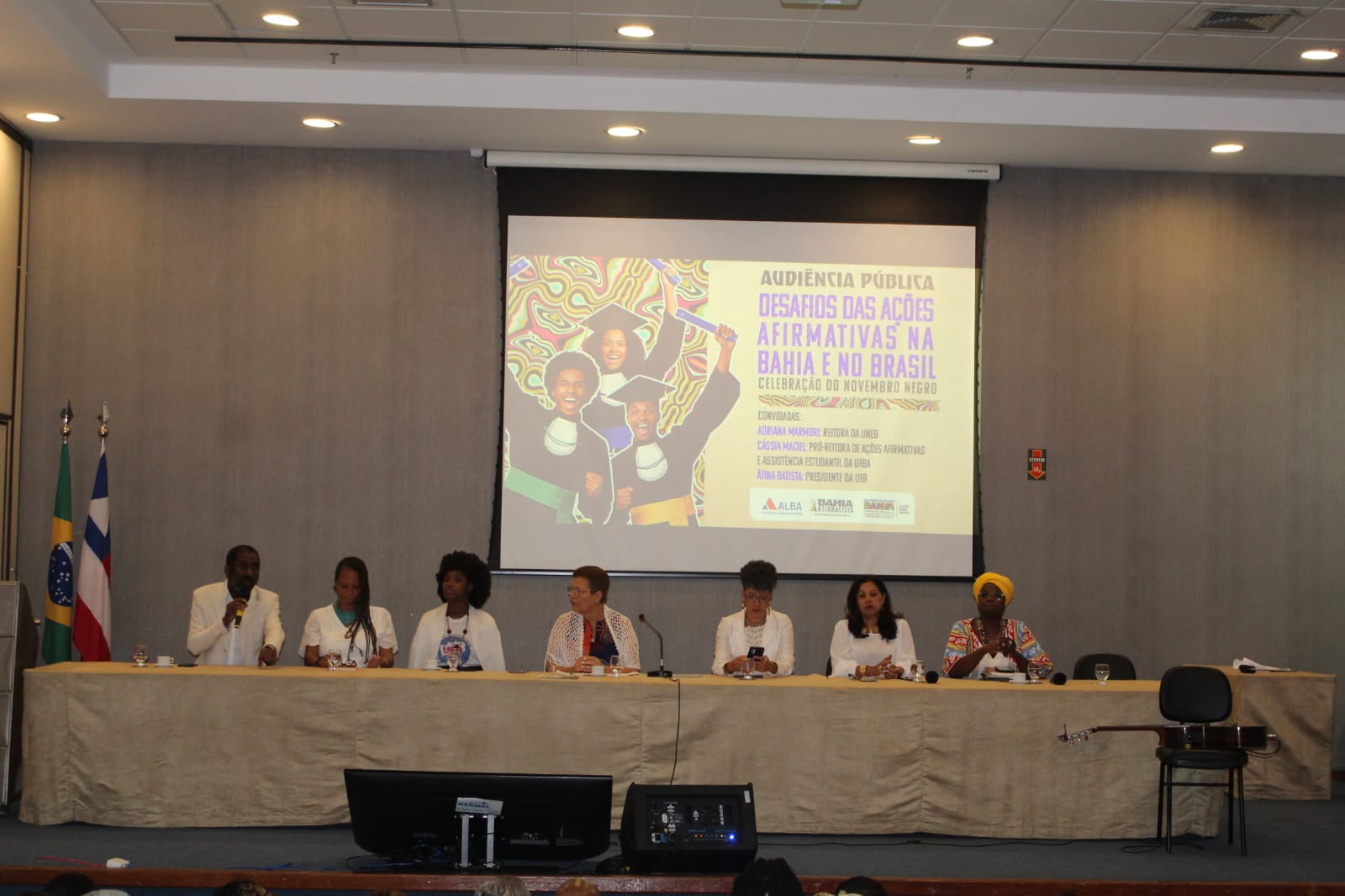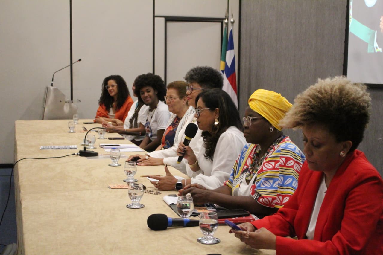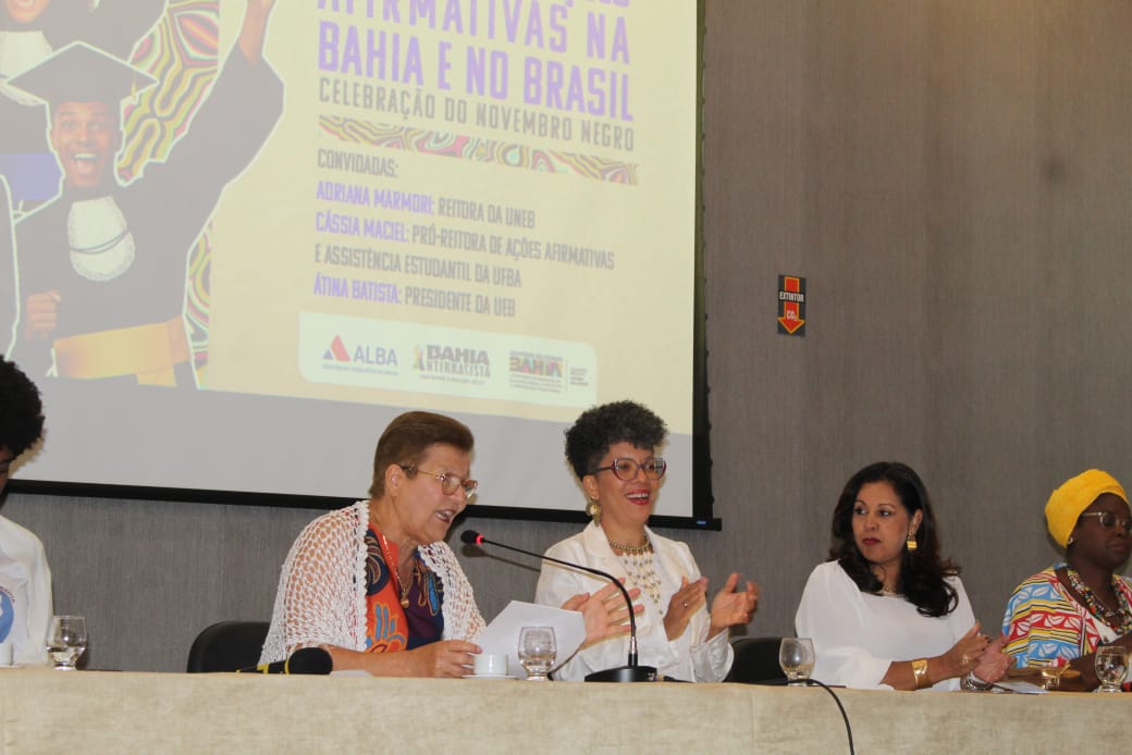 A mesa, composta pela secretária da Sepromi, Ângela Guimarães; a reitora da Universidade do Estado da Bahia (UNEB), Adriana Marmori; a pró-reitora de Ações Afirmativas e Assistência Estudantil da Universidade Federal da Bahia (UFBA), Cássia Maciel; e a presidenta da União dos Estudantes da Bahia (UEB), Átina Batista, foi mediada pela deputada estadual Fátima Nunes.