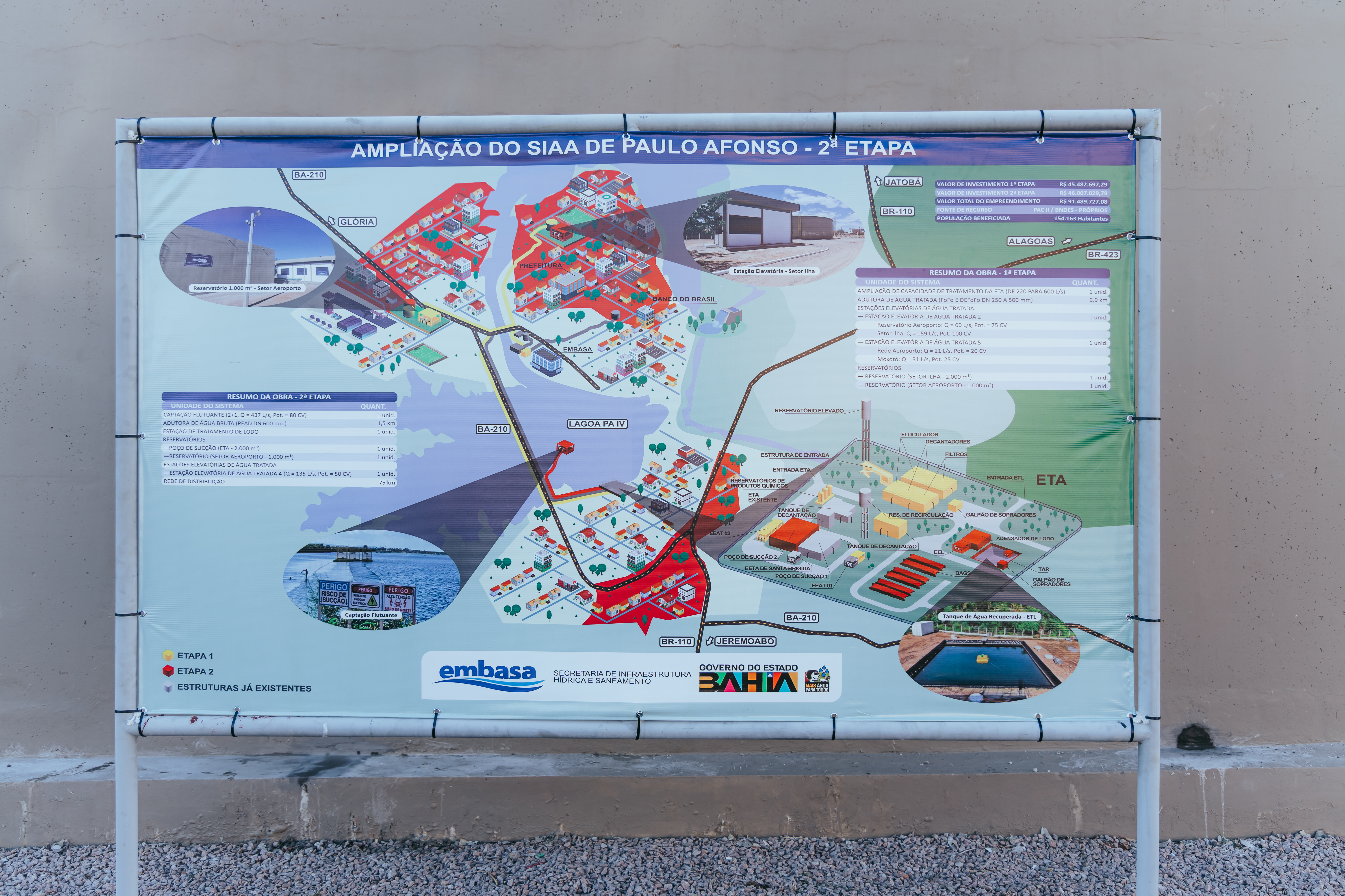 A obra é uma iniciativa do Governo do Estado da Bahia, por meio da Secretaria de Infraestrutura Hídrica e Saneamento (SIHS), em parceria com a Empresa Baiana de Águas e Saneamento (Embasa). O projeto foi viabilizado com recursos do Banco Nacional de Desenvolvimento Econômico e Social (BNDES) e da própria Embasa, totalizando um investimento superior a R$ 46 milhões.