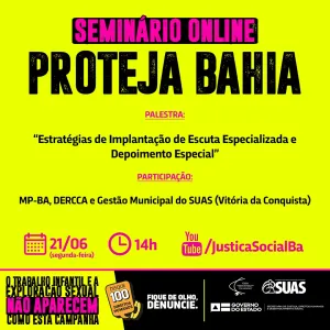 Seminário Proteja Bahia 2021 discute estratégias de Escuta Especializada na próxima segunda-feira (21)