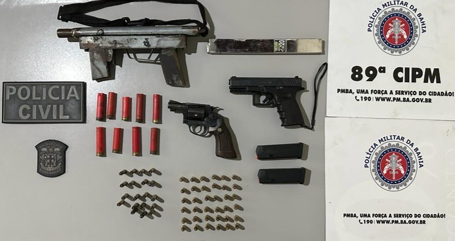 Uma submetralhadora de fabricação caseira, uma pistola 9 mm e um revólver calibre 38 foram apreendidos no distrito de Argolo, na quarta-feira (3), durante operação conjunta da Delegacia Territorial (DT) de Nova Viçosa com uma equipe do PETO da 89ª Companhia Independente de Polícia Militar (CIPM).