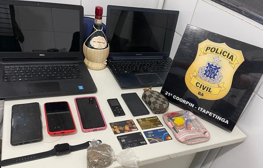 O flagrante se deu menos de 24 horas após o crime, ocorrido na segunda-feira (15). Dois notebooks, três celulares, um relógio, um gravador digital, uma bateria externa, um estojo, 100 gramas de maconha e quatro cartões bancários foram recuperados com os autores.