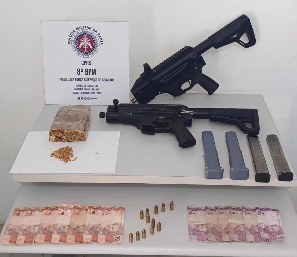 Duas submetralhadoras calibre 9mm, carregadores, munições, um tablete de crack e R$ 100 foram encontrados no porta-malas de um veículo, nesta quinta-feira (15). Equipes do 8° Batalhão da Polícia Militar (BPM/Porto Seguro) realizavam uma blitz próximo ao distrito de Brejinhos, no momento do flagrante.