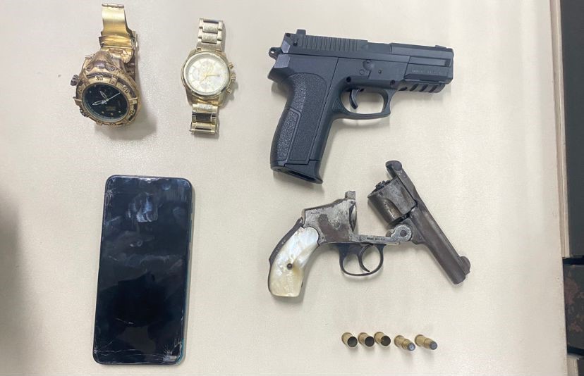 Os militares realizaram rondas na região, quando avistaram o automóvel suspeito que, ao notar a presença dos pms, tentou fugir. O carro foi alcançado e, durante a abordagem, os policiais encontraram um revólver calibre 38 com três munições deflagradas e duas intactas, um aparelho celular, uma pistola falsa e dois relógios.