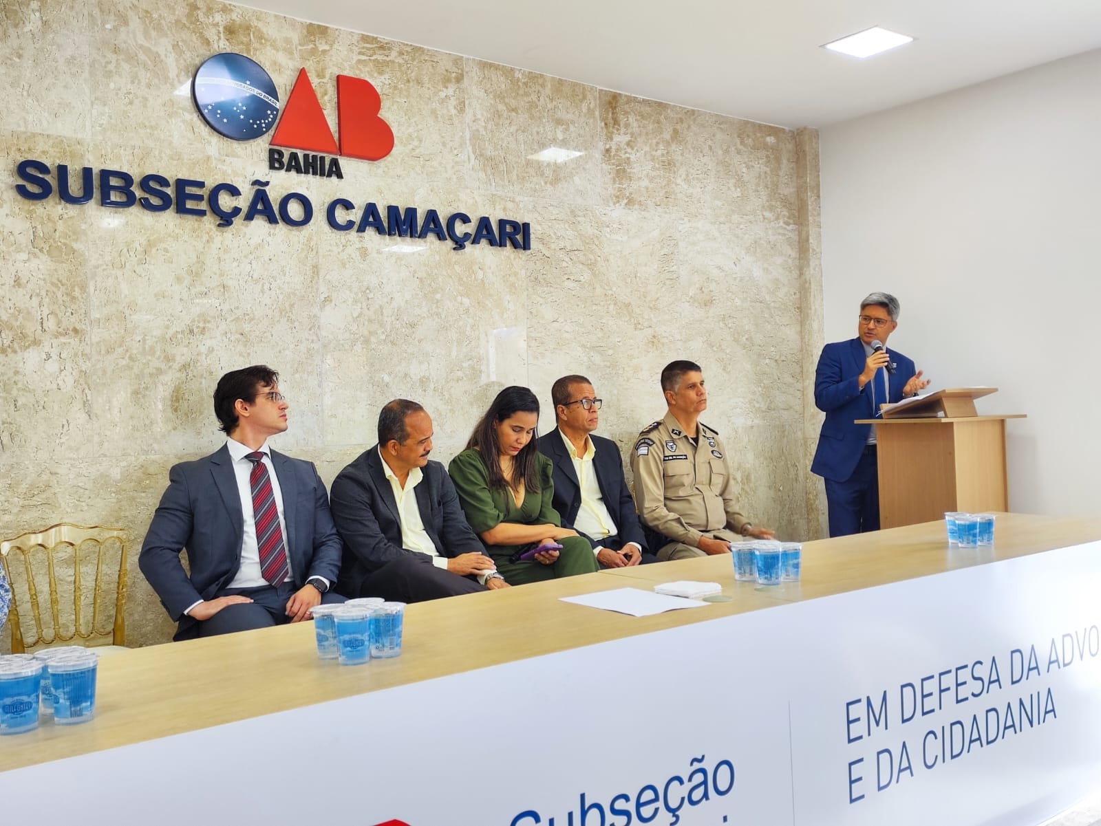 A bancada de autoridades da apresentação do plano foi formada pelo chefe de gabinete da SSP, Nelson Gaspar, o prefeito de Camaçari, Antônio Elinaldo Araújo da Silva, o coordenador do Comitê Interinstitucional em Segurança Pública do Estado da Bahia (CISP/ MP), promotor Gabriel Andrade, o presidente da Câmara Municipal, Flávio Mattos, o secretário de Administração Municipal, André Anilton e pela coordenadora do programa de pós-graduação em segurança pública (Proges/ UFBA), Ivone Freire.