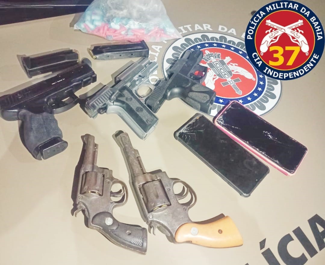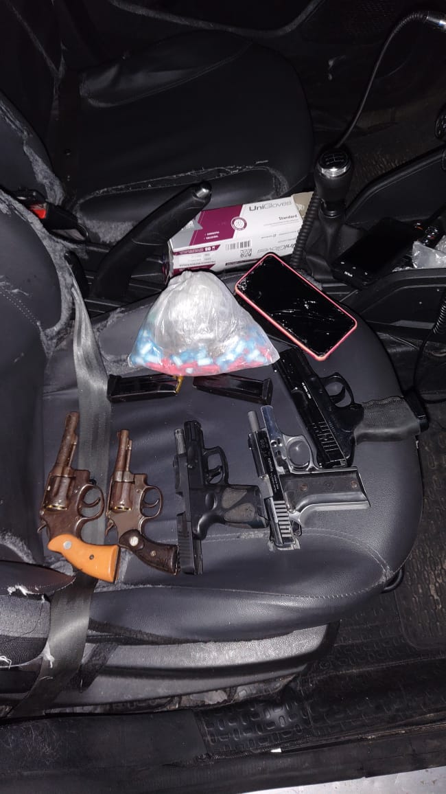 Com os criminosos foram encontradas duas pistolas, dois revólveres, um simulacro e diversos pinos de cocaína prontos para a venda.