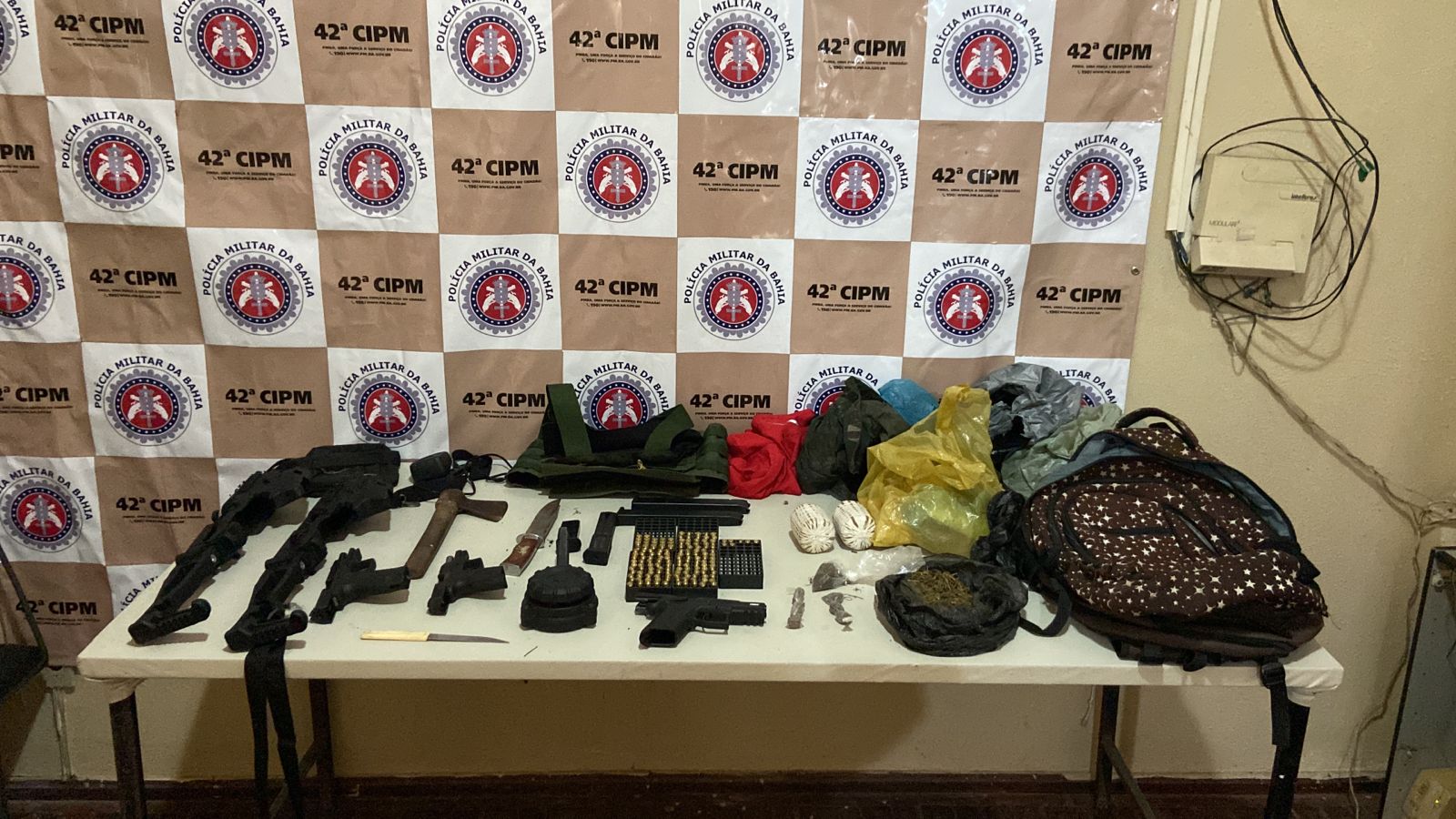 No local onde eles se escondiam foram achadas uma pistola .40, três espingardas, cerca de 300 munições de calibres 9 milímetros, 12, 36, 38, 40, carregadores alongados com capacidade para 30 munições, mais de meio quilo de maconha e outras nove trouxas da erva, 10 artefatos explosivos, rádios comunicadores, máquinas de cartão, notebooks e materiais usados no tráfico de drogas.