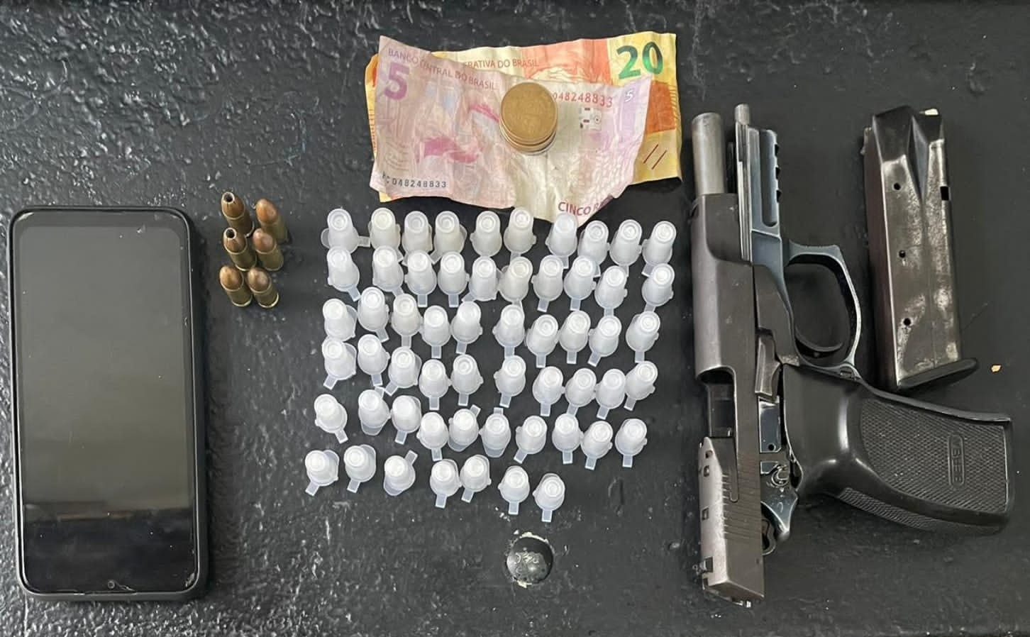 Com o foragido foram apreendidos uma pistola calibre 9mm, carregador, munições, 57 pinos de cocaína, celular e 27 reais.