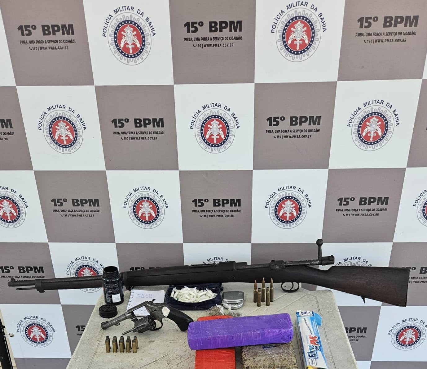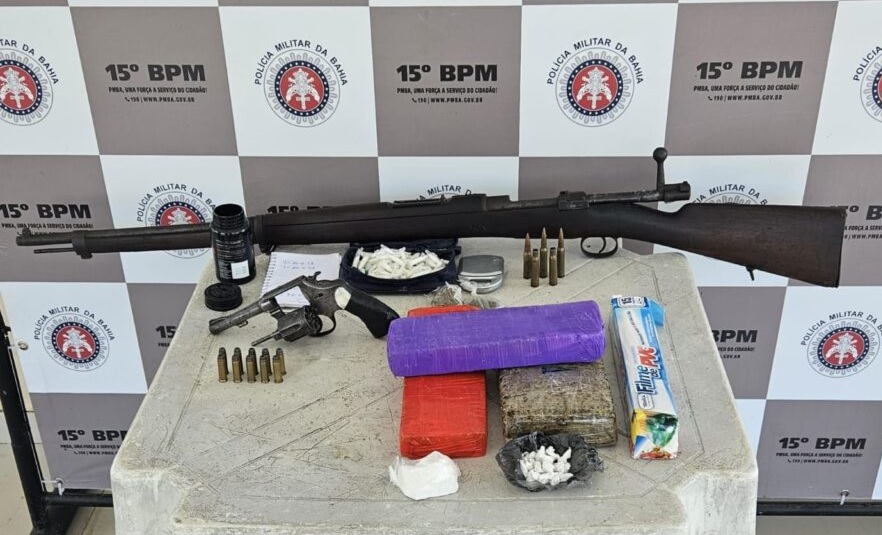 Também foram apreendidos um revólver calibre 38, estojos, munições para o fuzil, porções de Cocaína, pedras de crack e maconha.