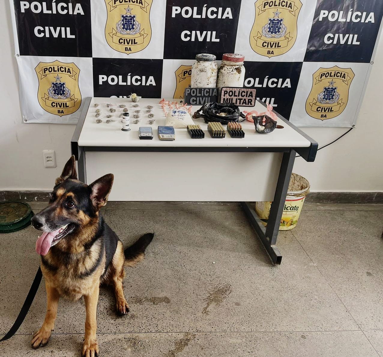 A ação foi realizada em conjunto com policiais militares e contou com os animais do Grupamento de Operações com Cães, da PM. O material estava enterrado em baldes, dentro de um terreno baldio, no bairro Irmã Dulce. Em um imóvel próximo ao local ainda foi encontrada uma bicicleta. O resultado da apreensão será enviado ao Departamento de Polícia Técnica (DPT), para passar por perícia.