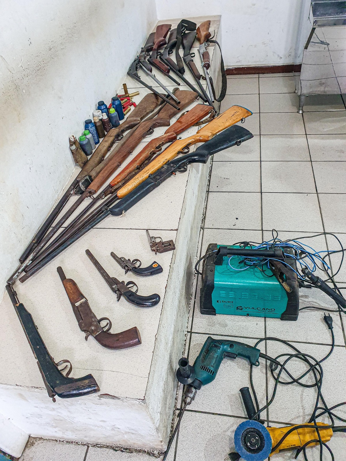 Além das armas de fogo, a PM também apreendeu 30 cartuchos de diversos calibres (.22, .12 .28.38.36 .32), inclusive deflagrados; 11 recipientes contendo pólvora e chumbo para municiamento de armas artesanais; corpo de espingarda Rossi cano longo (calibre .36); lixadeira industrial; furadeira de impacto industrial e uma máquina de solda industrial.