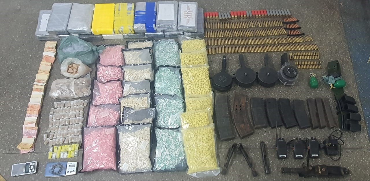 Em um imóvel utilizado pelos integrantes de uma facção, os militares encontraram 15 kg de cocaína, 22 mil pastilhas de ecstasy, dois sacos com grande quantidade de pedras de crack, R$ 4 mil, três granadas, carregadores para fuzil, entre eles alguns do modelo caracol que amplia a capacidade de munições, rádios comunicadores, tripé para armamento portátil, cerca de 500 munições para pistola, submetralhadora e fuzil, além de embalagens plásticas e balanças.