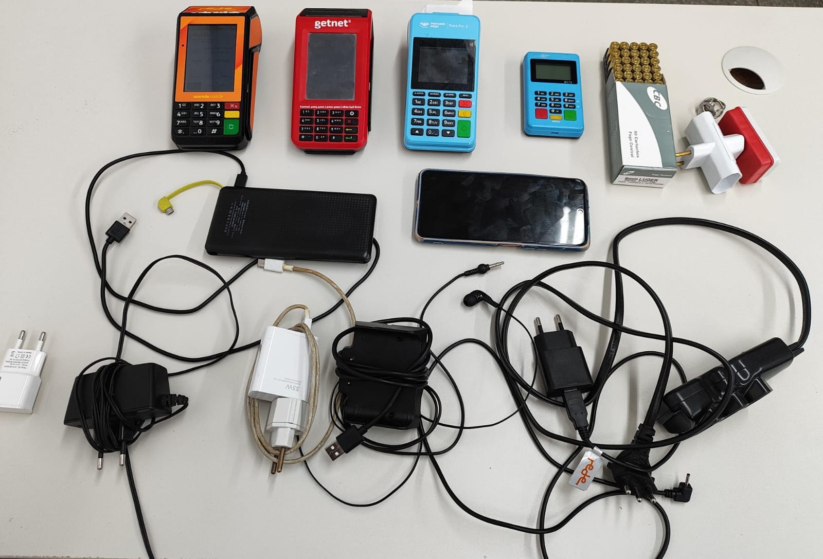 Durante o cumprimento dos mandados de prisão e de busca e apreensão, foram encontradas quatro maquinetas de cartões de crédito, uma caixa de munições 9 mm – calibre de uso restrito – e um aparelho celular.