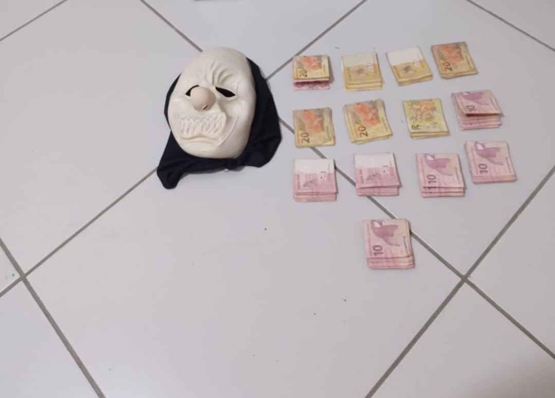 Em continuidade às diligências para localizar os autores, a PM conseguiu localizar os dois adolescentes com uma parte do dinheiro roubado, que no momento da apreensão estavam com uma máscara.