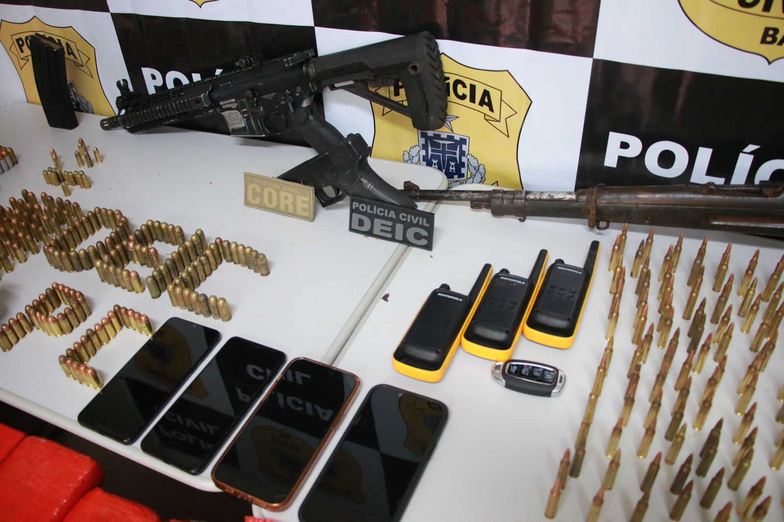 A Polícia Civil da Bahia, por meio do Departamento Especializado de Investigações Criminais (Deic), desarticulou, no município de Candeias, nesta segunda-feira (23), um bunker e apreendeu aproximadamente meia tonelada de drogas, entre maconha, crack e cocaína, dois fuzis calibres 5.56 e 7.62 e milhares de munições. Todo material foi apreendido dentro de um imóvel que pertence a um dos fugitivos do sistema prisional, responsável pelo tráfico de drogas naquela região e também um dos líderes de um grupo criminoso.