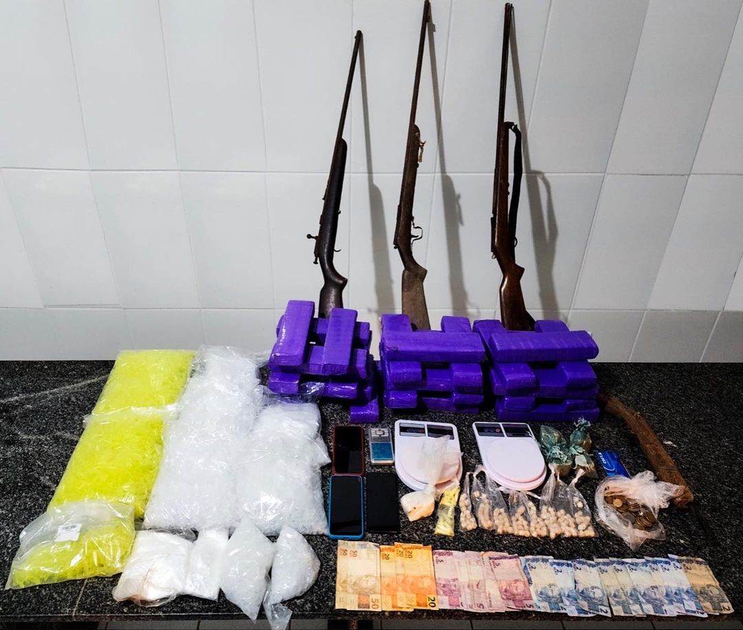 Militares da 44ª Companhia Independente da Polícia Militar (CIPM/ Medeiros Neto) flagraram dois suspeitos de tráfico de drogas com 20 quilos de entorpecentes (maconha, crack e cocaína), três espingardas e uma garruncha, além de três celulares e duas balanças, dinheiro em espécie e pinos vazios de cocaína, na terça-feira (7), no distrito de Cruzeiro de Sul, zona rural de Vereda. Os capturados foram encontrados no momento do repasse dos entorpecentes.