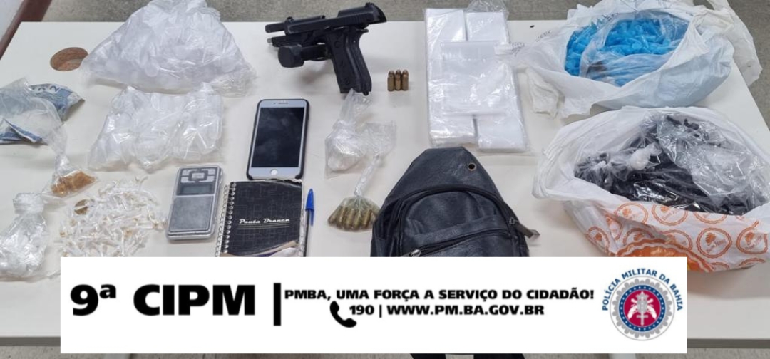 Uma pistola, drogas e materiais usados no tráfico de entorpecentes foram encontrados por equipes da 9ª Companhia Independente da Polícia Militar (CIPM/Pirajá), com um homem que ostentava armas nas redes sociais. Materiais foram apreendidos na noite de quarta-feira (8), no bairro de Fazenda Grande do Retiro, em Salvador.
