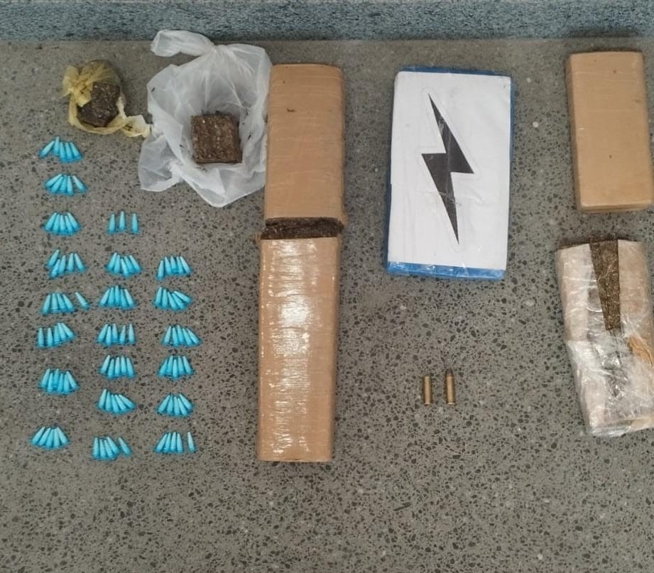 No interior da mochila, foram encontrados munições de calibre 38, três tabletes e três porções de maconha, um tablete e 108 pinos de cocaína.